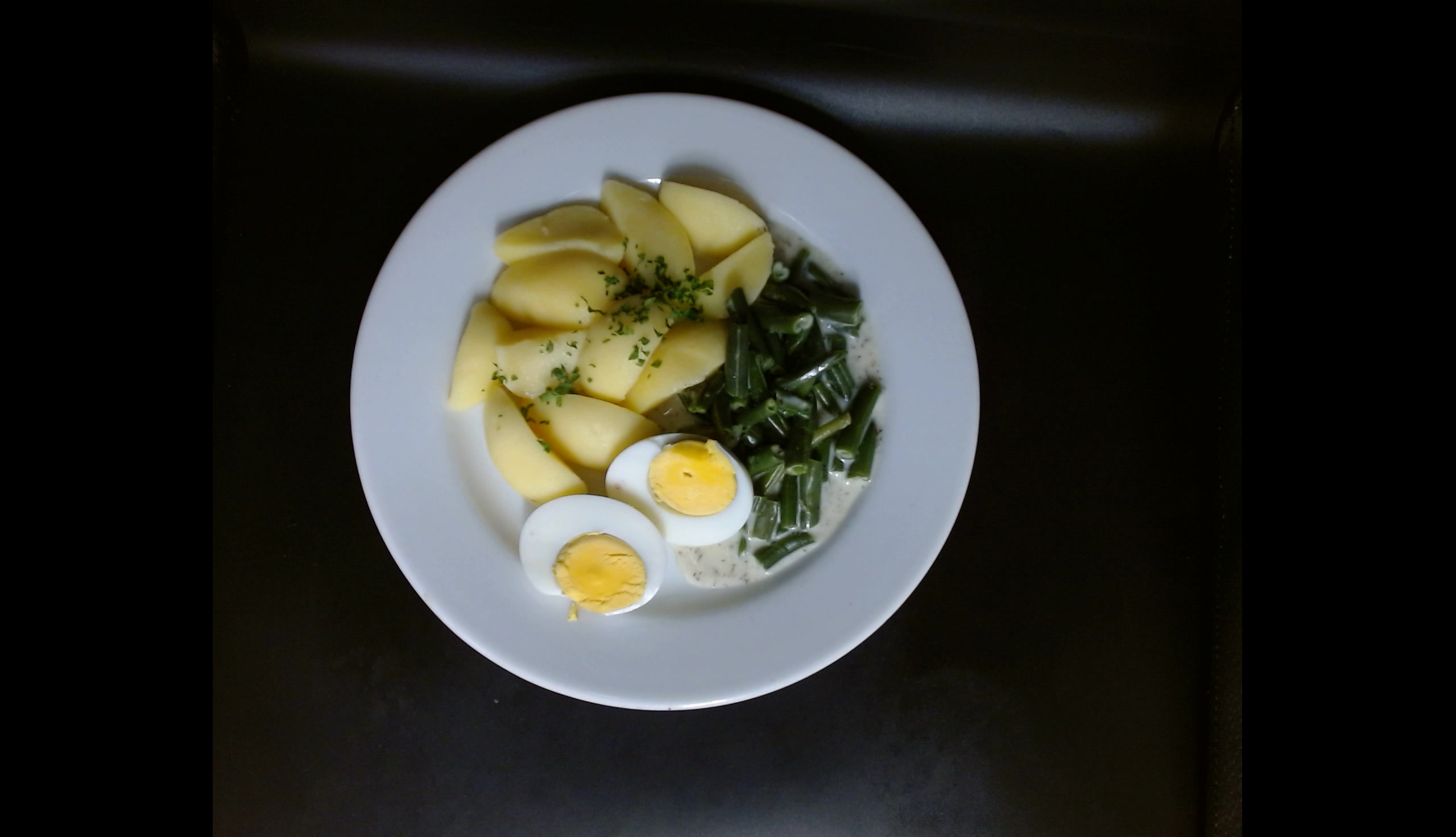 Fazolové lusky na smetaně s koprem, 1 vařené vejce, vařené brambory