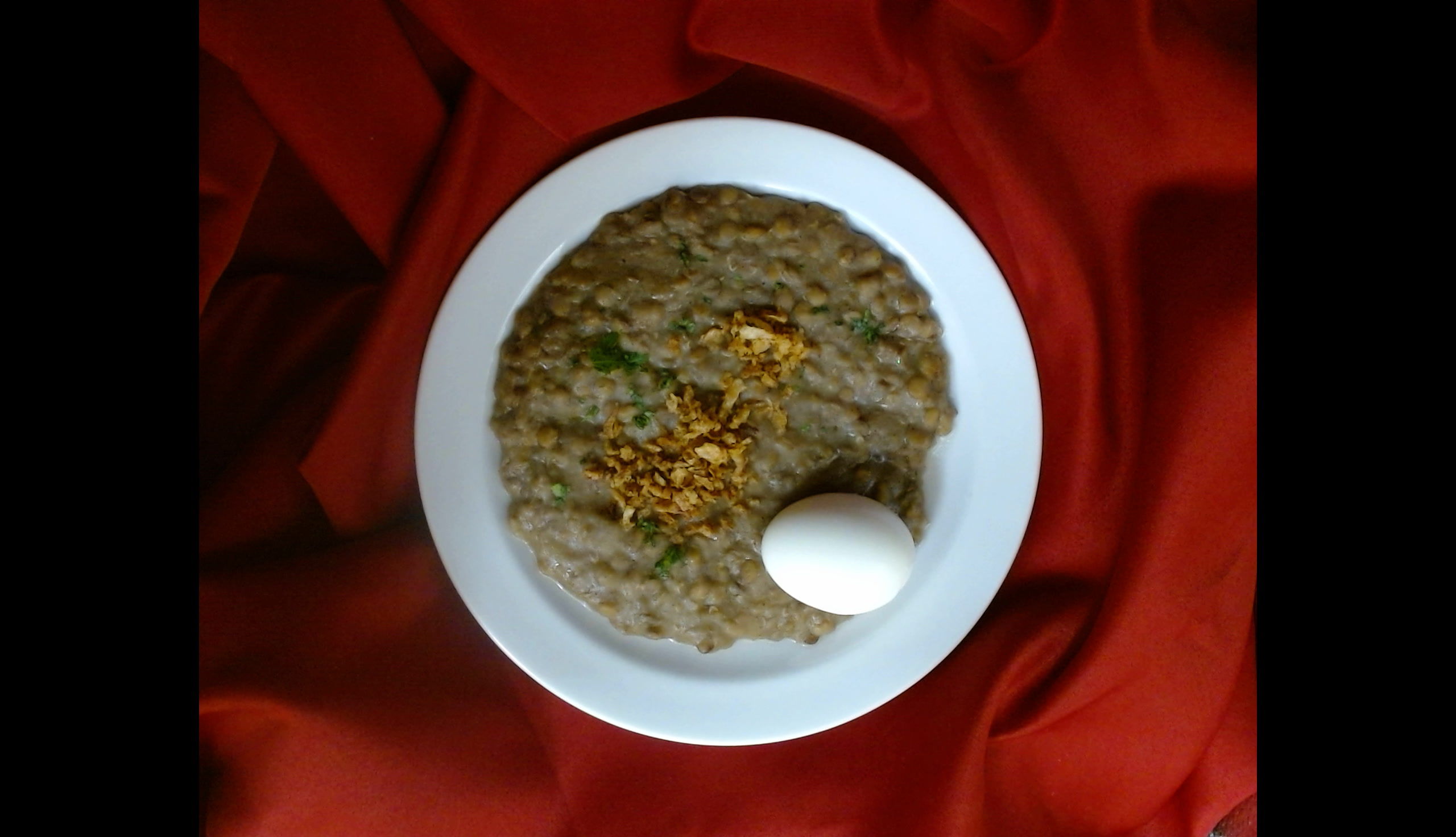 Čočka na kyselo s cibulkou, vejce natvrdo