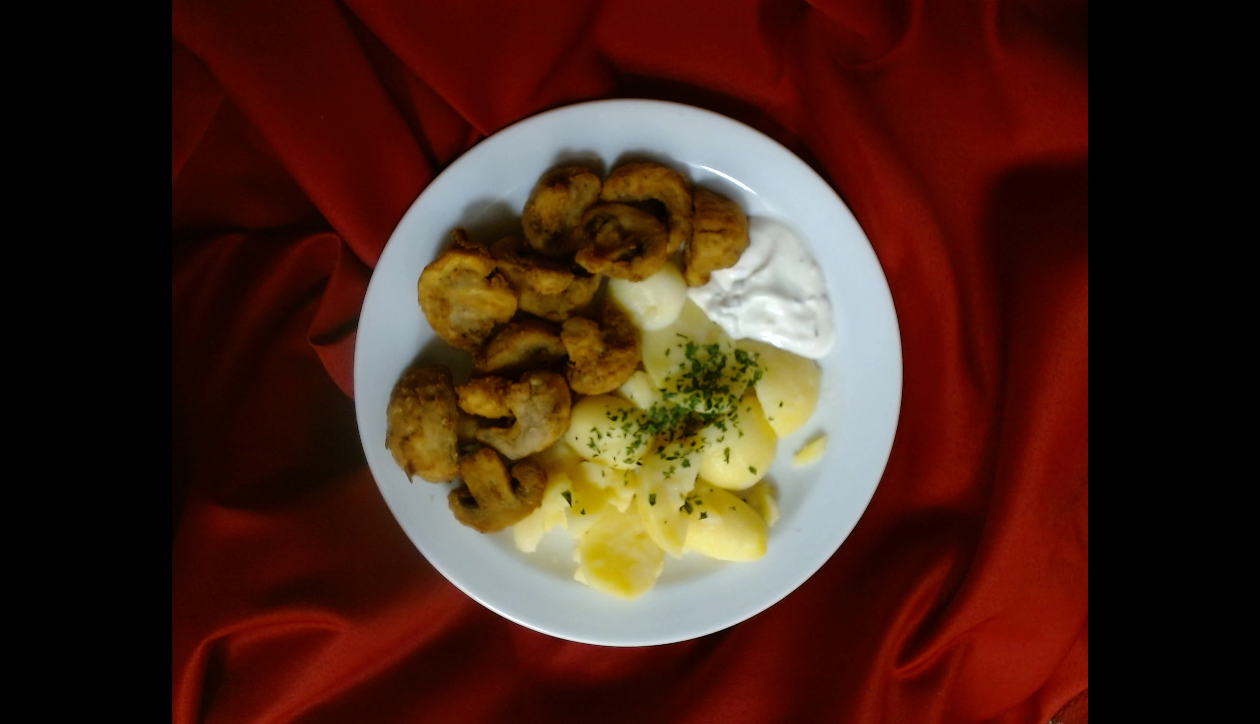Smažené žampiony, vařené brambory, tatarská omáčka