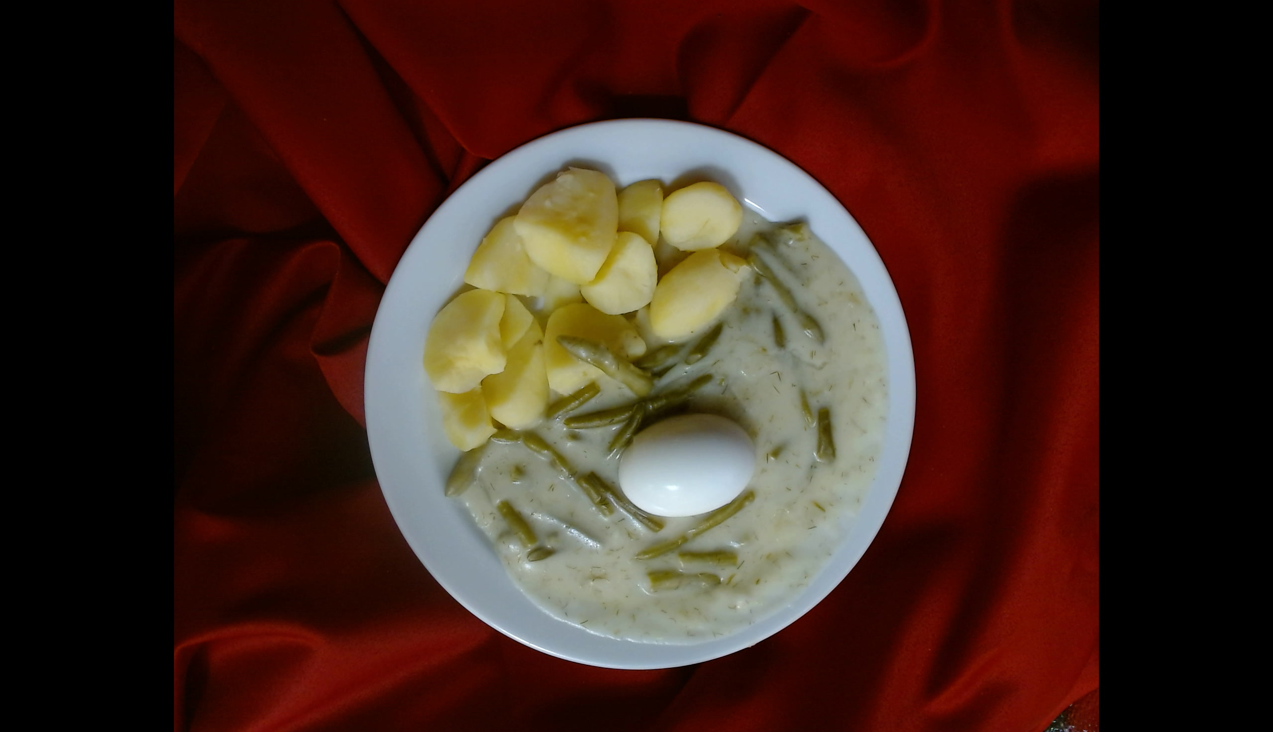 Fazolové lusky na smetaně s koprem, vařené vejce, vařené brambory