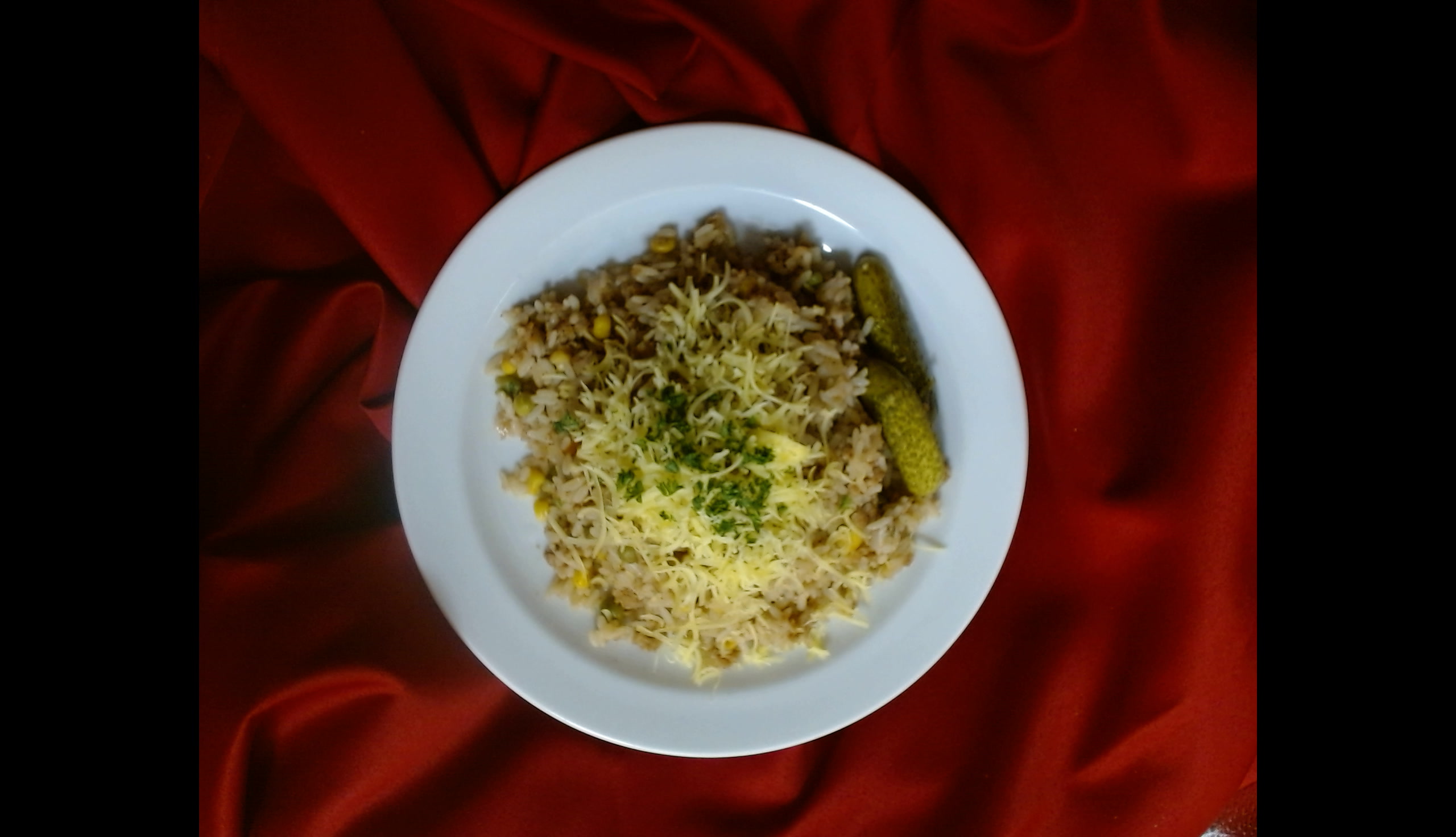 VEGAN Rizoto se sojovým masem a sýrem, okurka