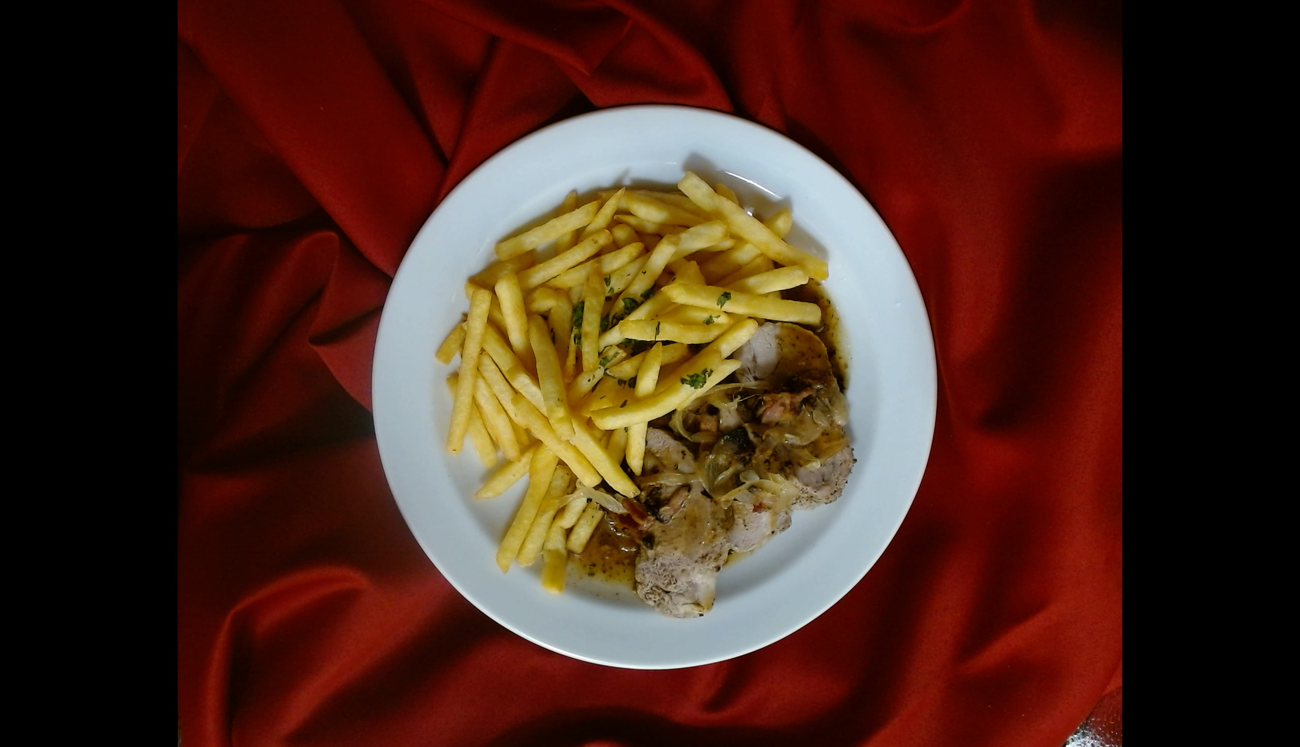Vepřová panenka z palce se slaninou a cibulí, bramborové hranolky