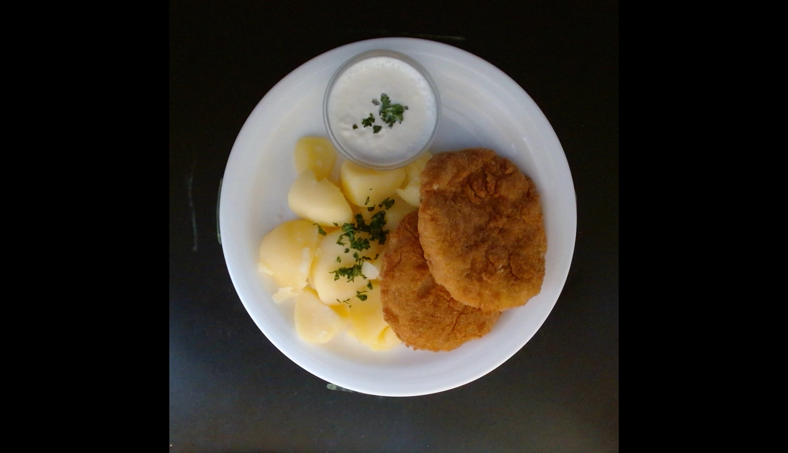 Květákové placičky se sýrem, vařené brambory, salsa dip