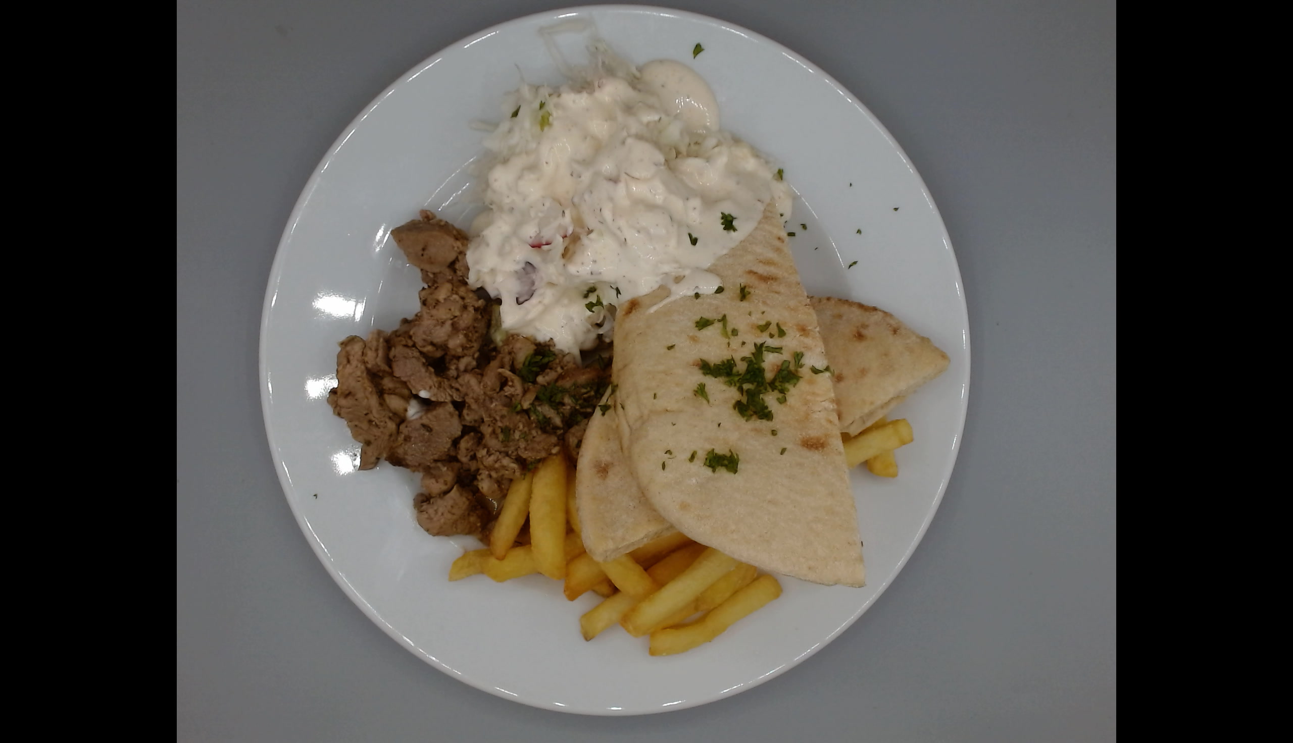 Krůtí gyros, pita chléb, poloviční hranolky, zelný salát s ředkvičkou