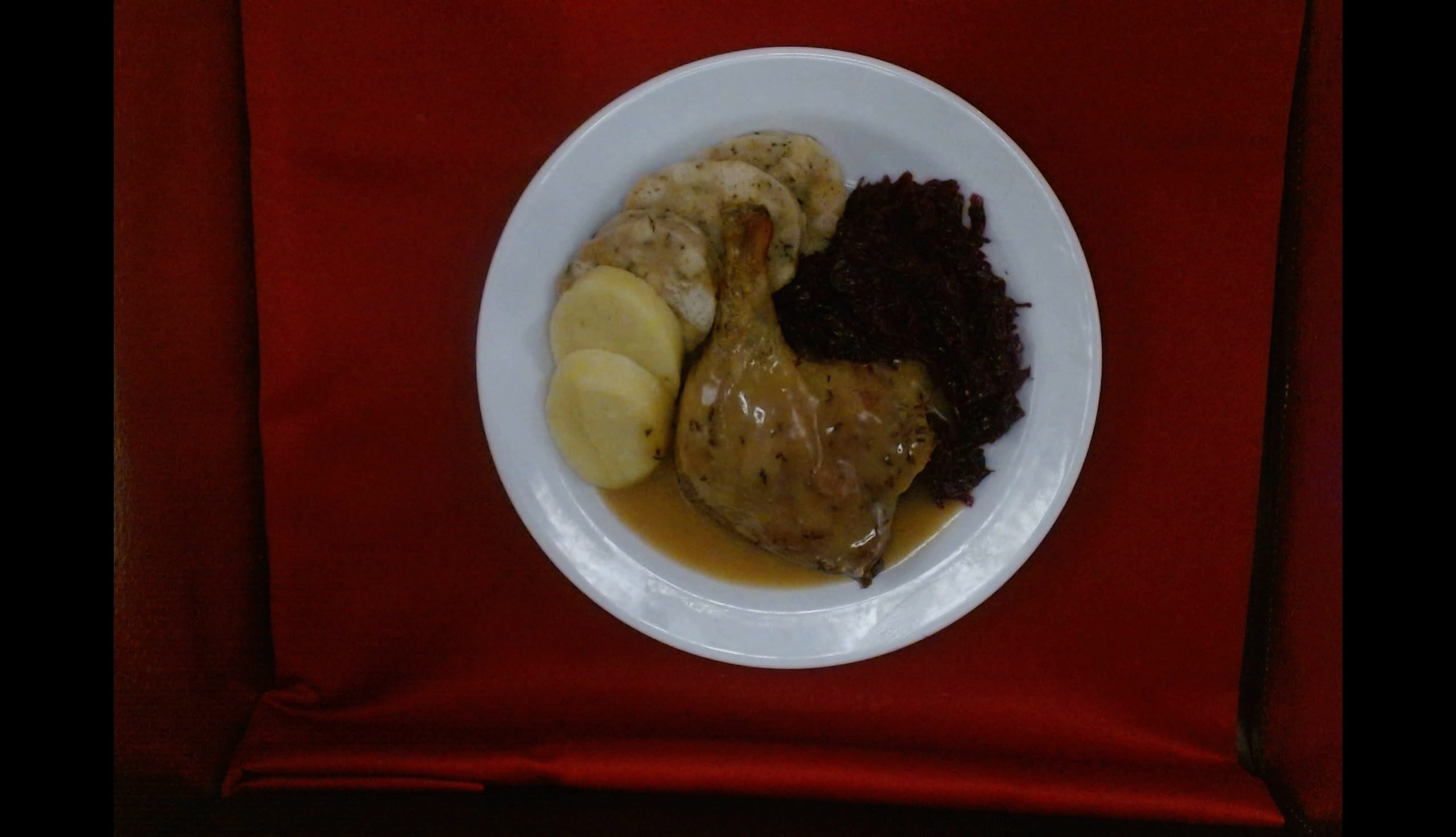 Pečené kachní stehno, 1/2 bramborové 1/2 karlovarský knedlík, červené zelí