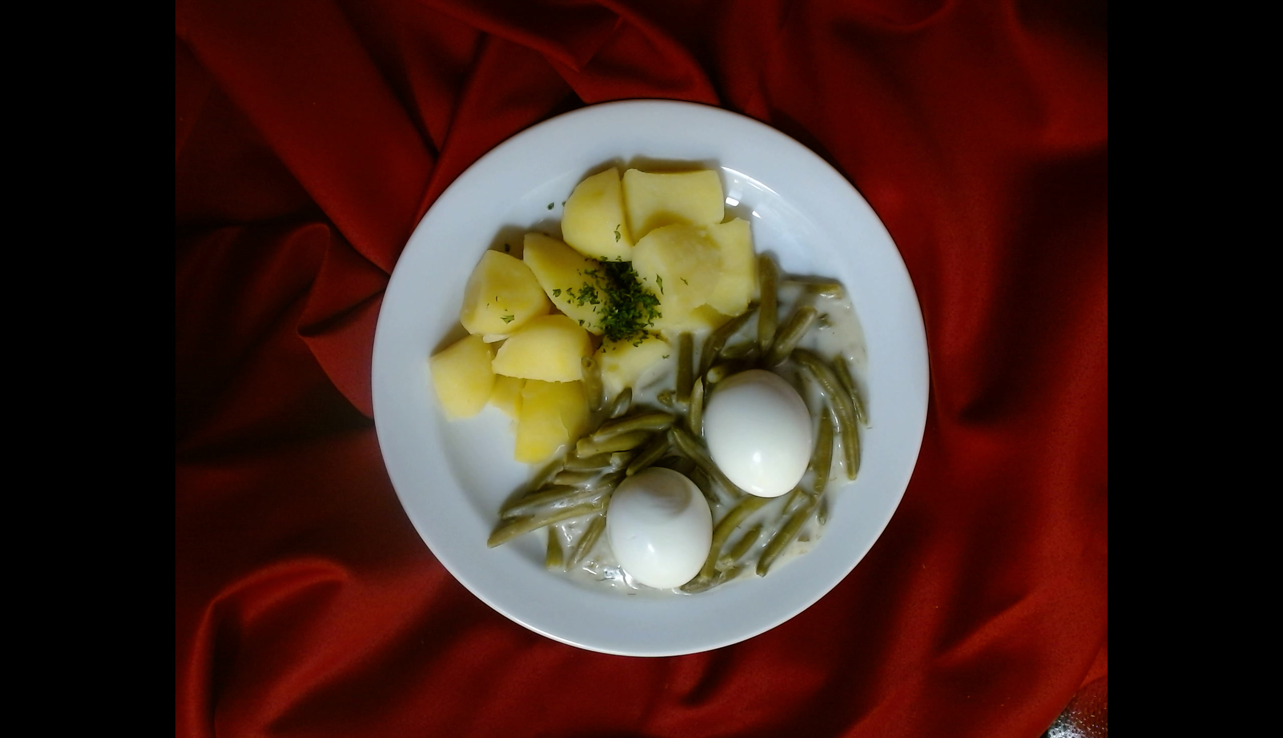 Fazolky na smetaně, vařené vejce, brambory