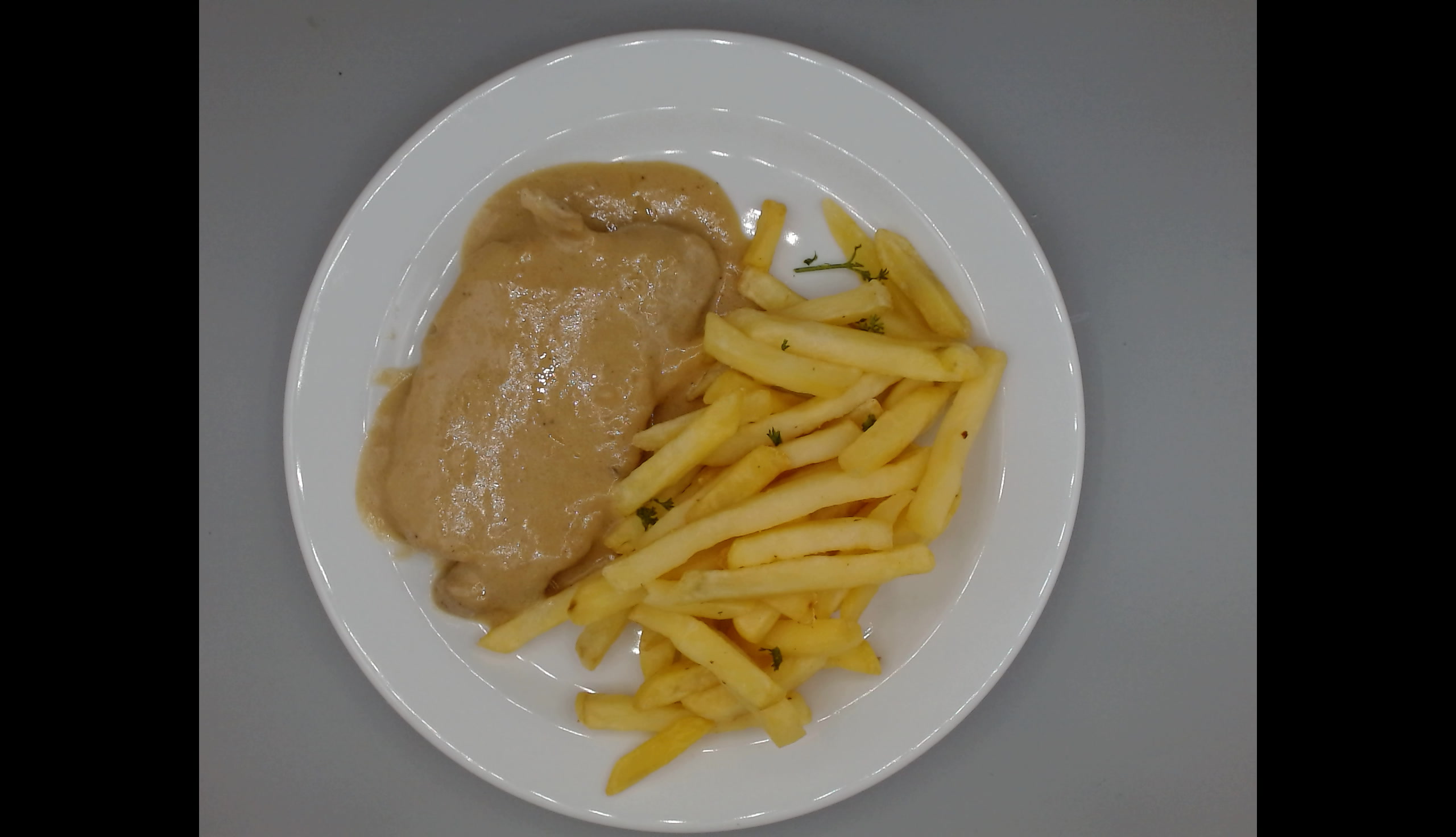 Vepřová kotleta s hořčičnou omáčkou, hranolky