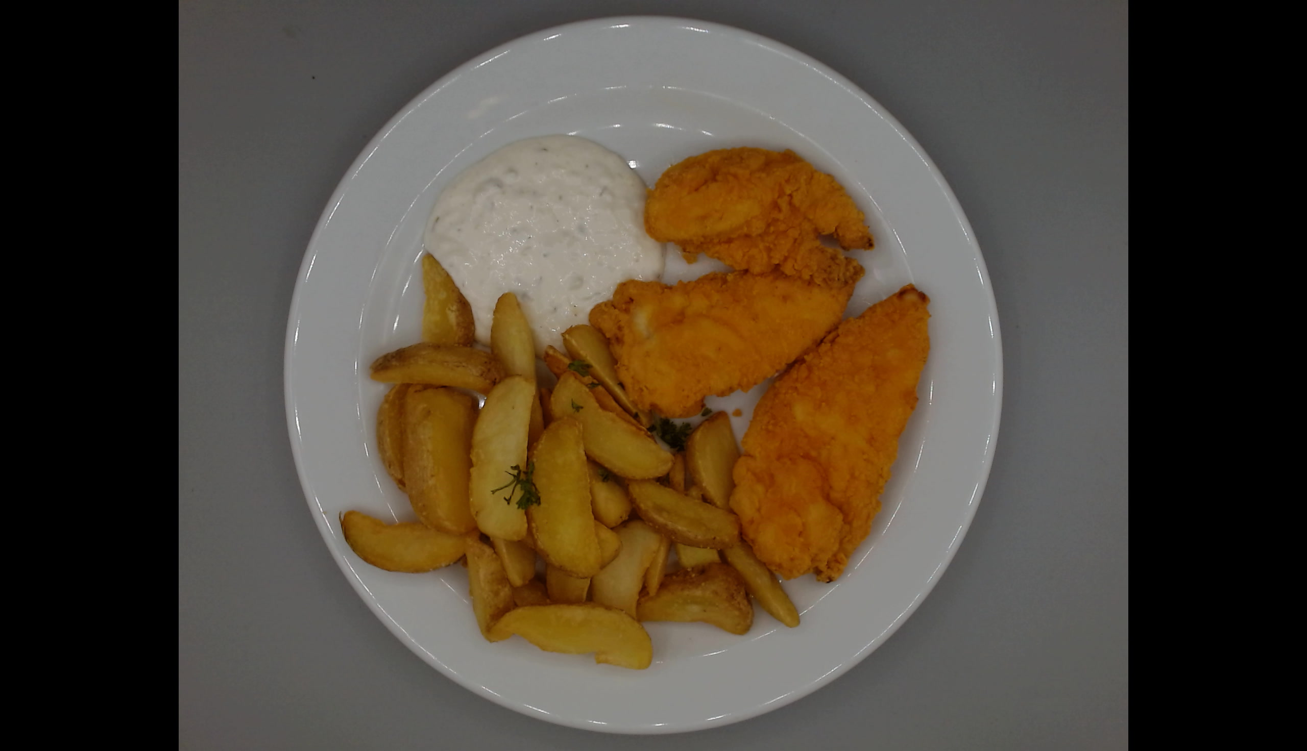 Kuřecí stripsy, americké brambory, tatarská omáčka