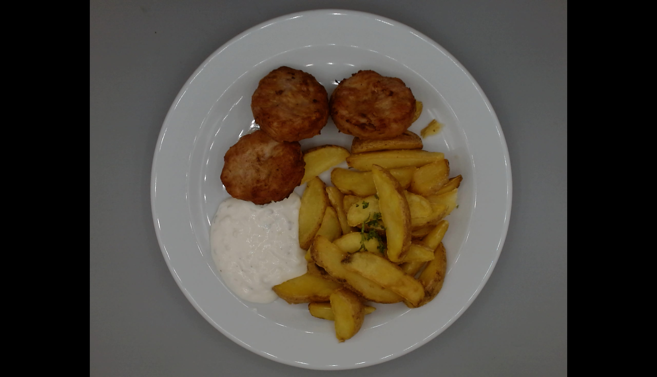 Kuřecí frikadely se sýrem, americké brambory, tatarská omáčka