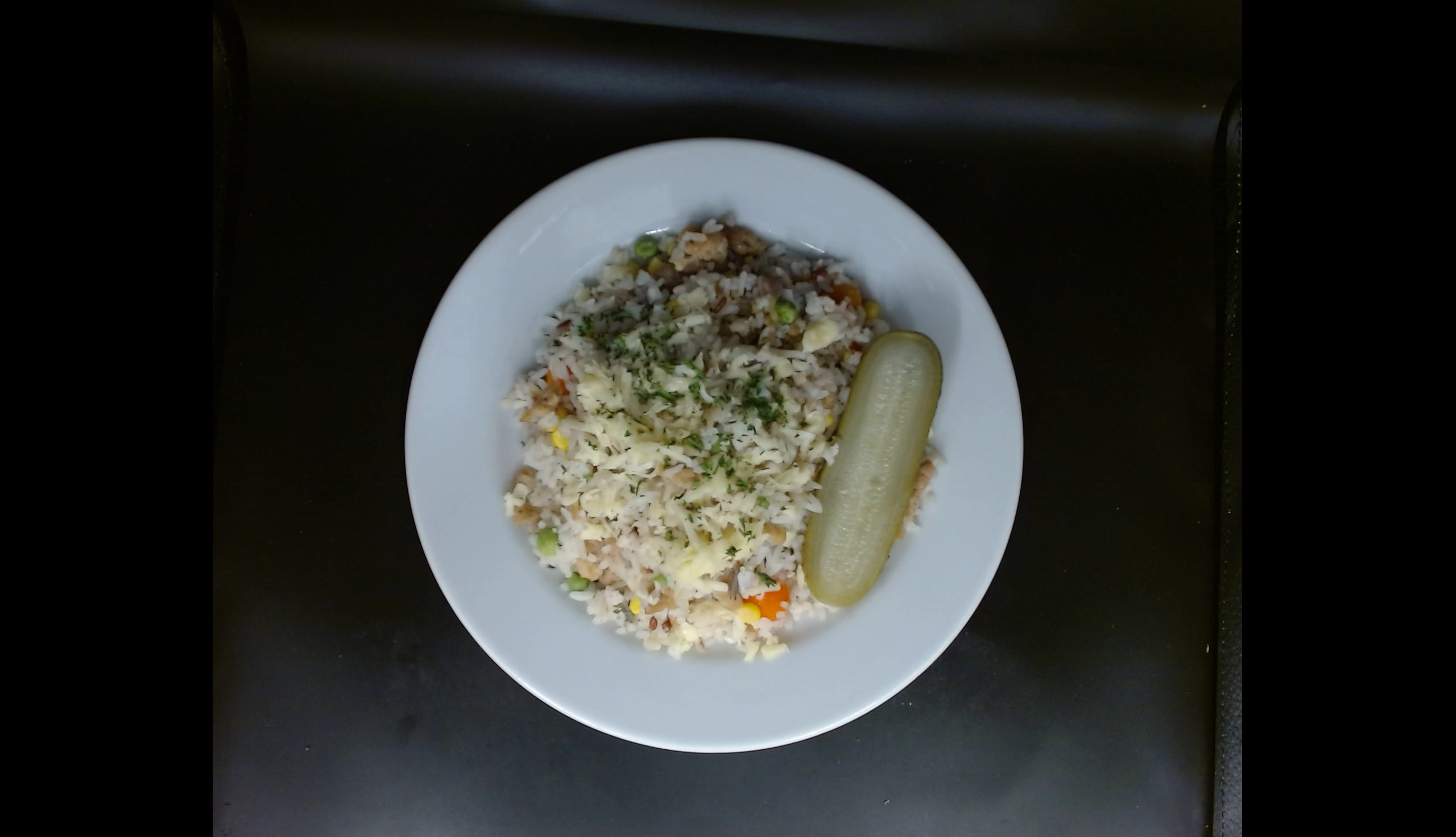 Rizoto z kuřecího masa, okurka, sýr