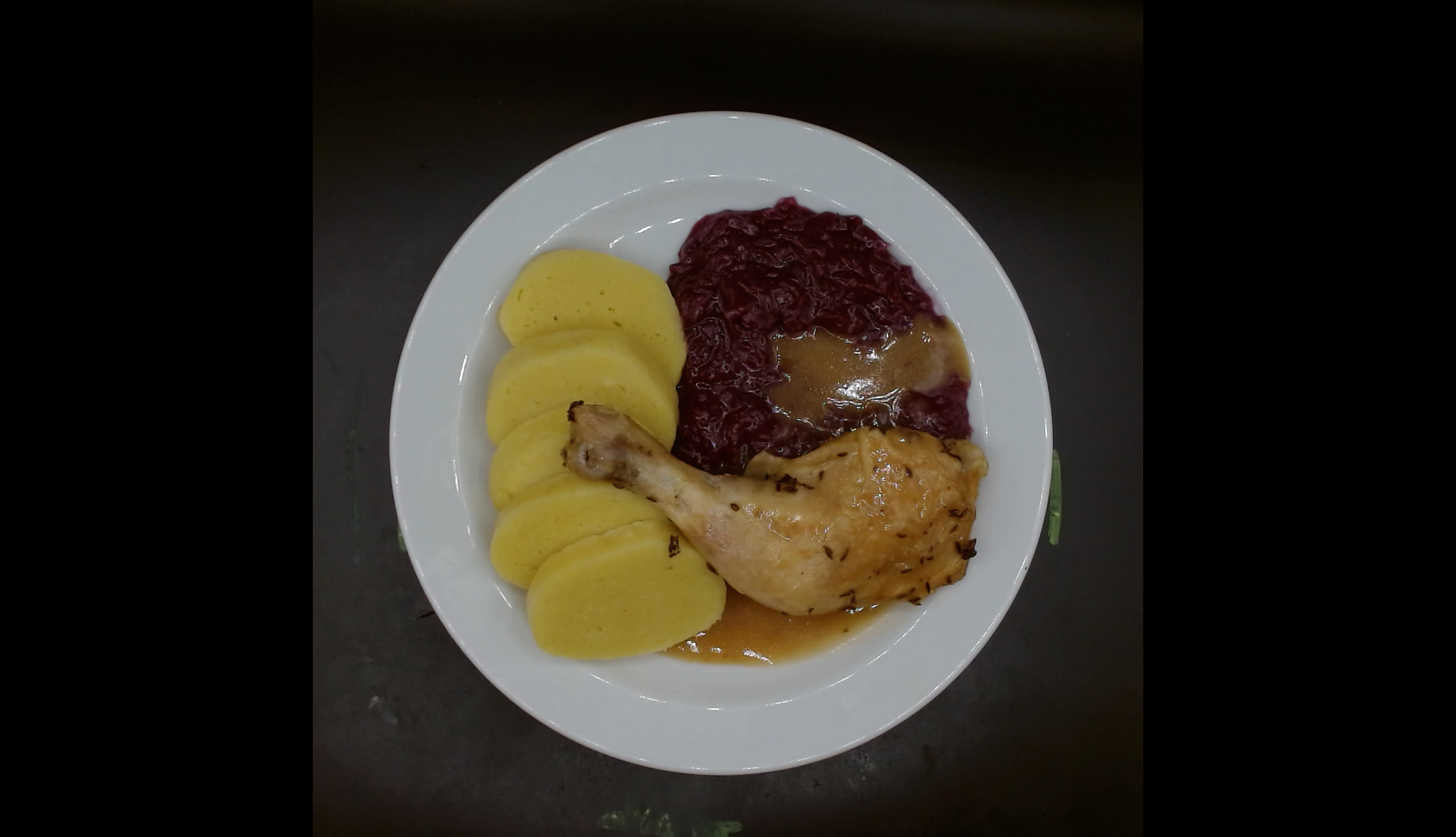 Vepřová pečeně, červené zelí, bramborové knedlíky
