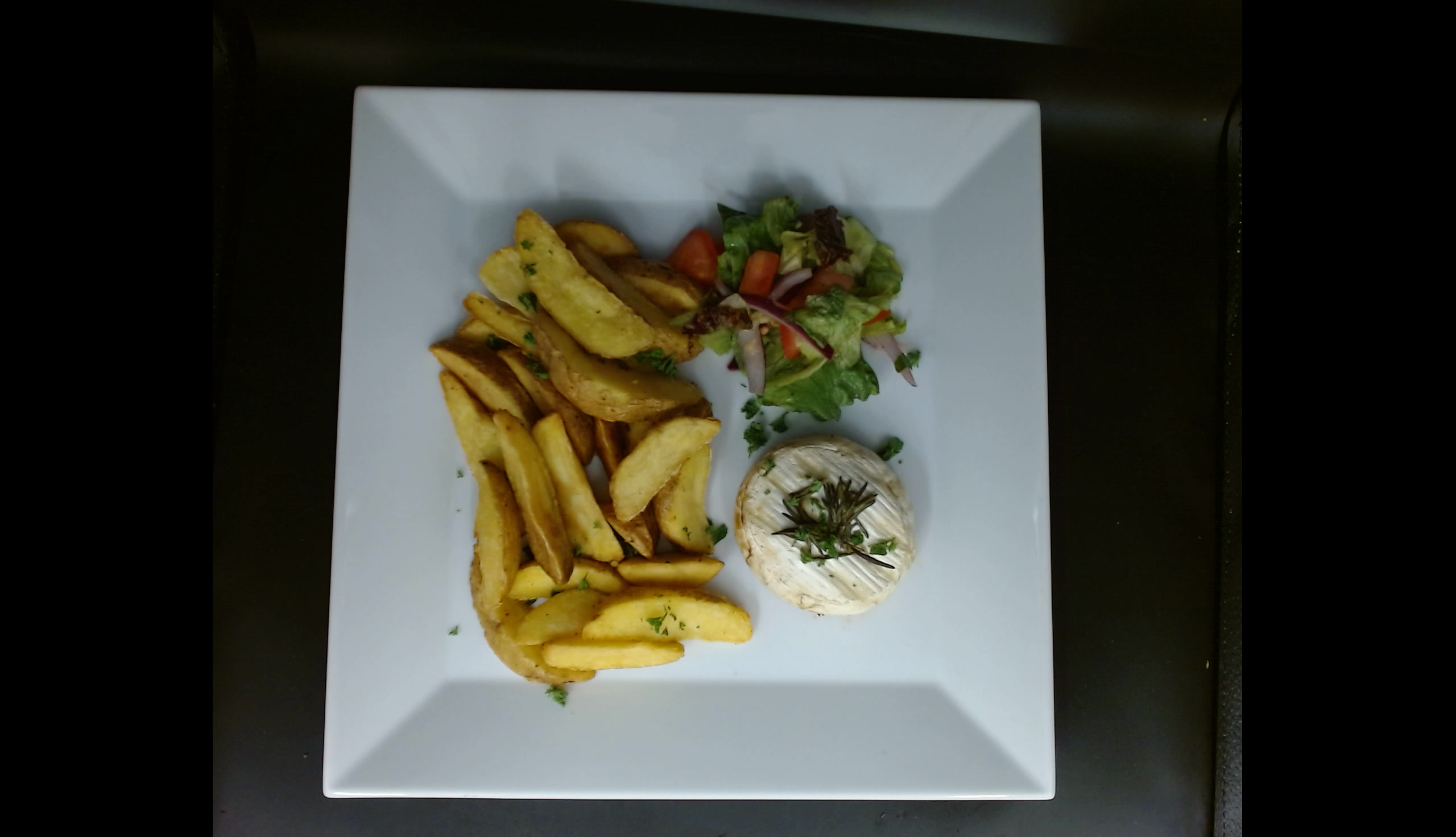 Grilovaný hermelín,míchaný zeleninový salátek, americké brambory