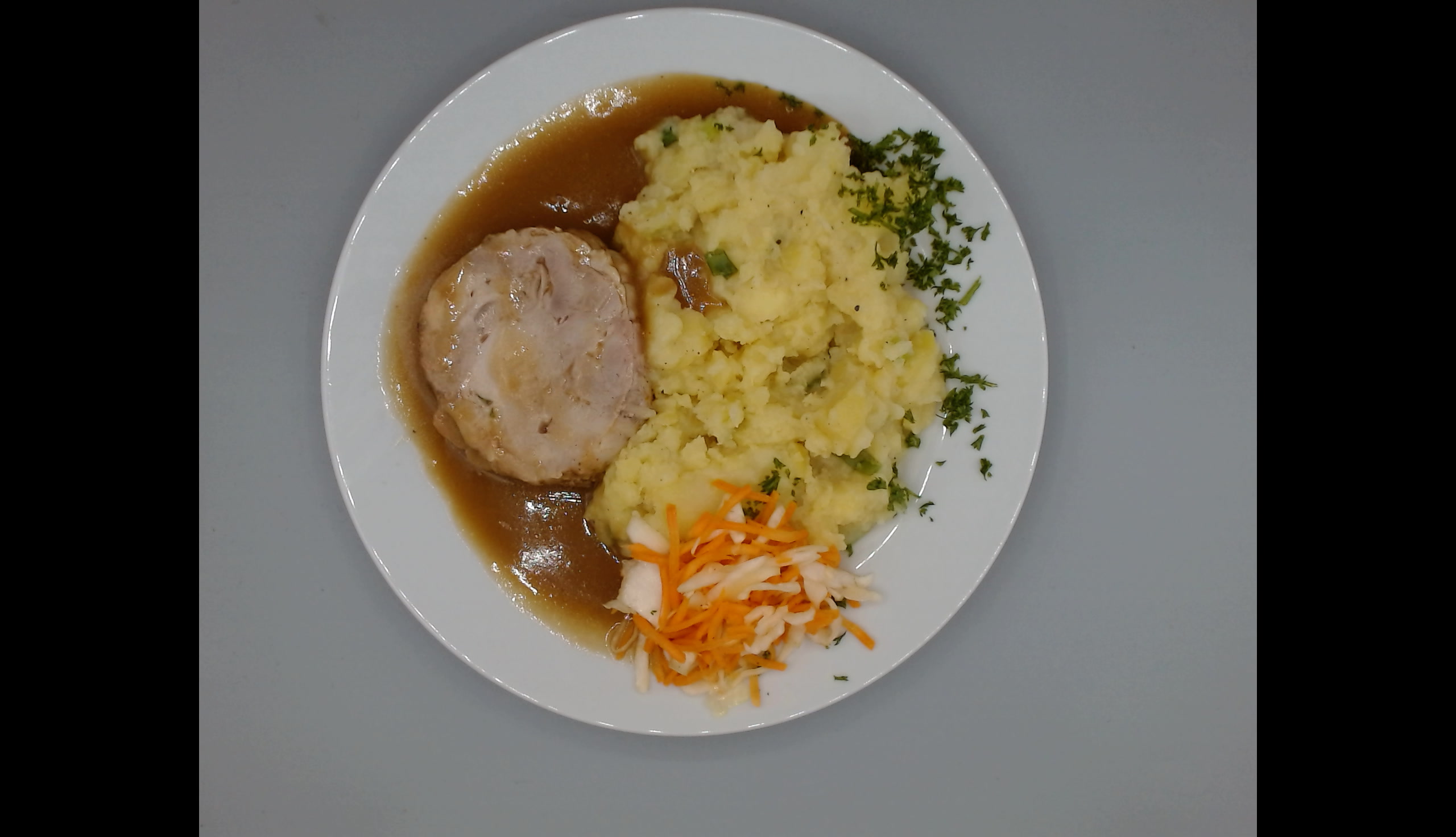 Kuřecí roláda plněná, šťouchané brambory, zelný salát s mrkví