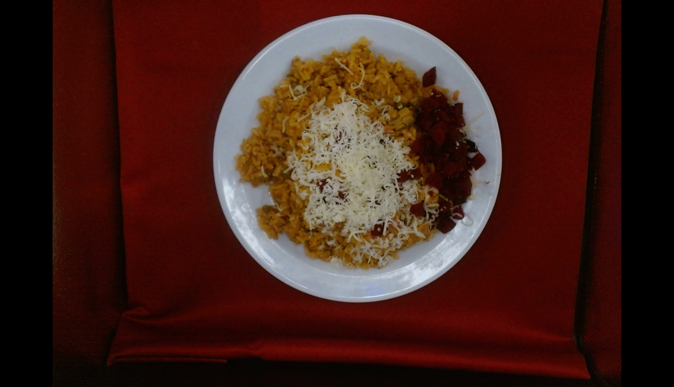 Srbské vepřové rizoto sypané sýrem, červená řepa sterilovaná