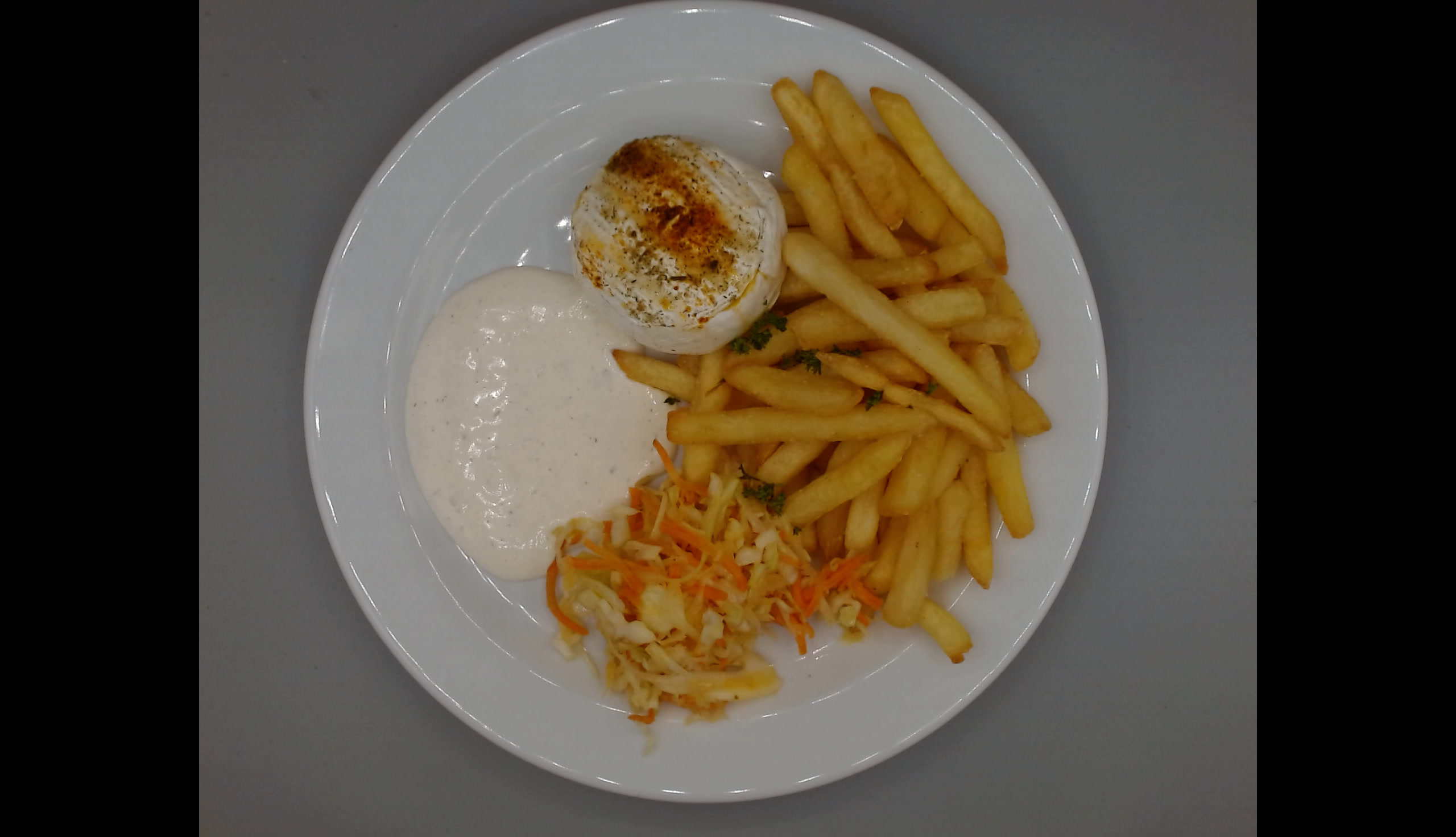 Grilovaný hermelín, bramborové hranolky, bylinkový dip, zelný salát s mrkví