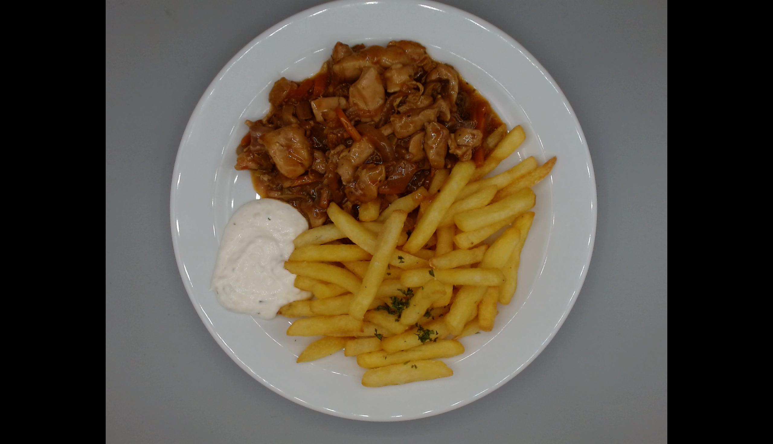 Kuřecí pikantní směs, hranolky, tatarská omáčka