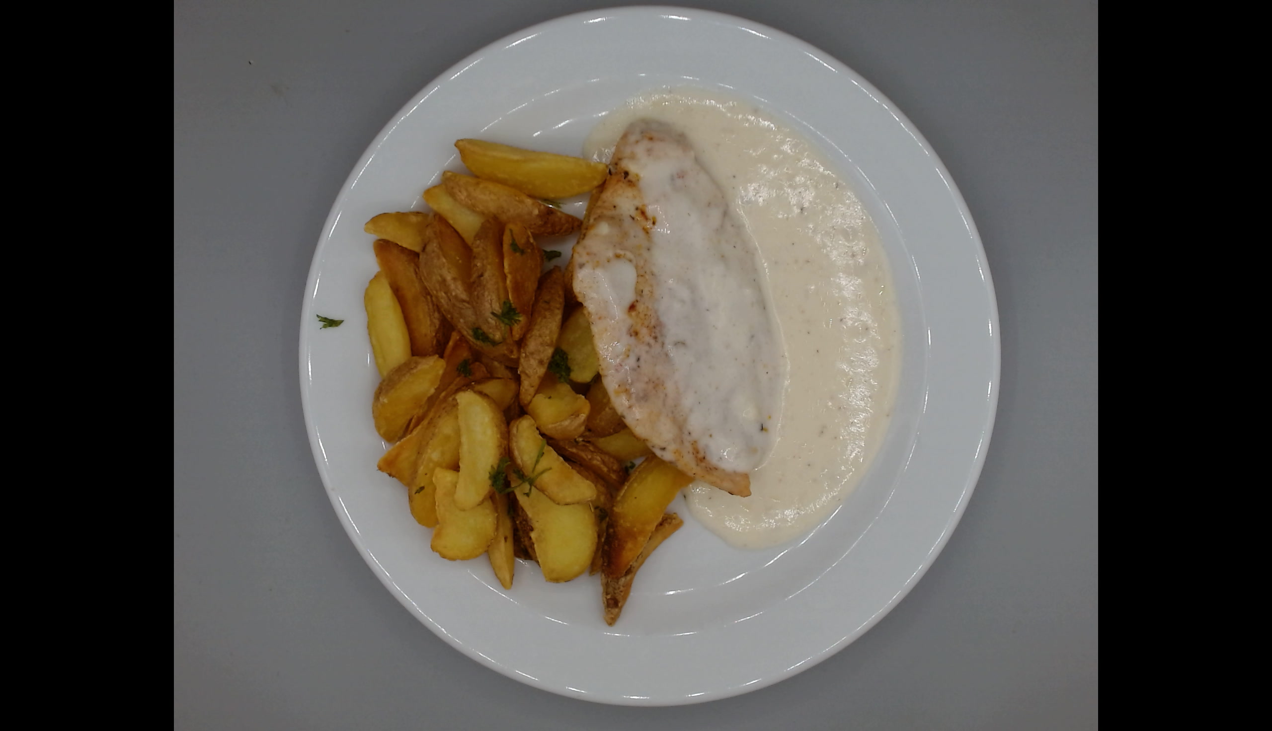 Kuřecí steak s česnekovým přelivem,americké brambory