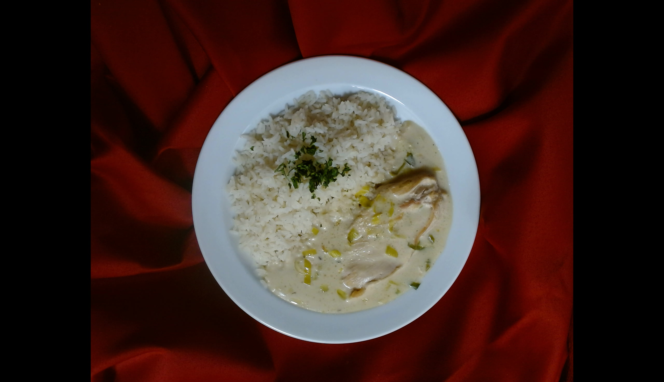 Kuřecí plátek na pórku a smetaně, dušená rýže