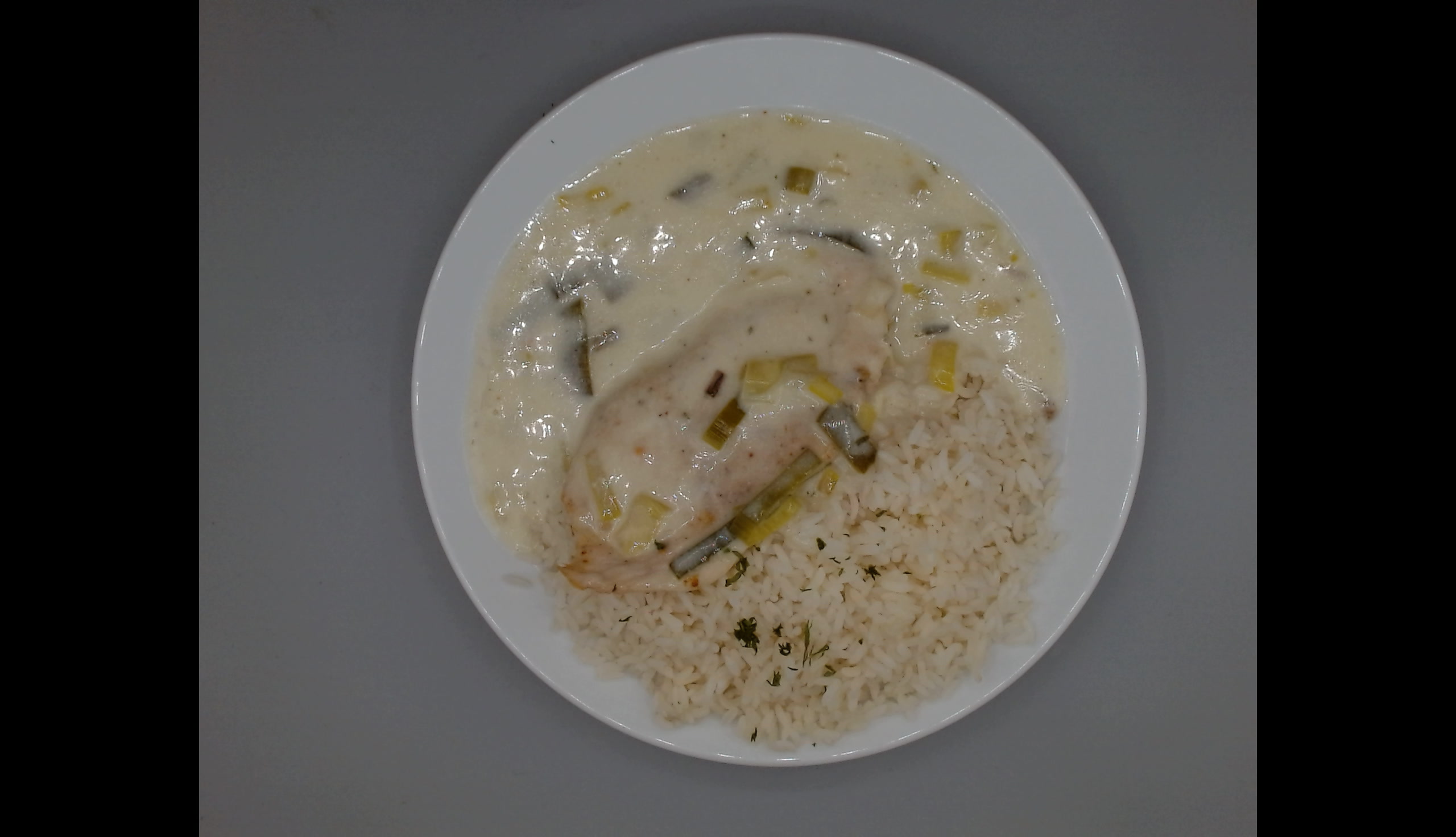Kuřecí plátek na pórku a smetaně, dušená rýže