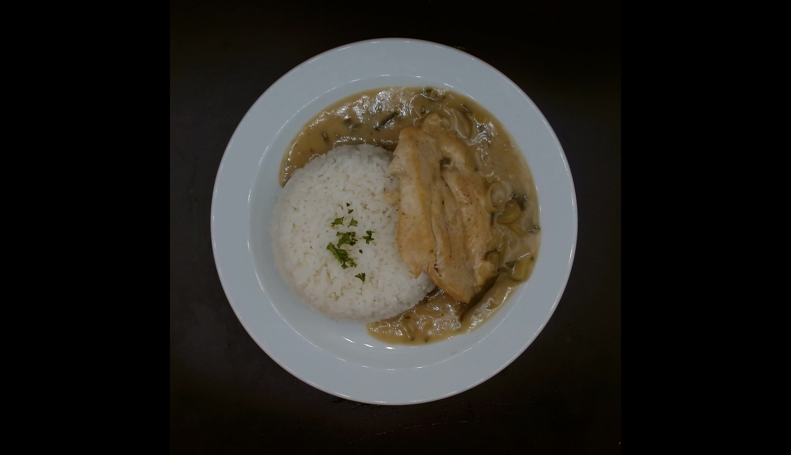 Kuřecí plátek na pórku a smetaně, dušená rýže