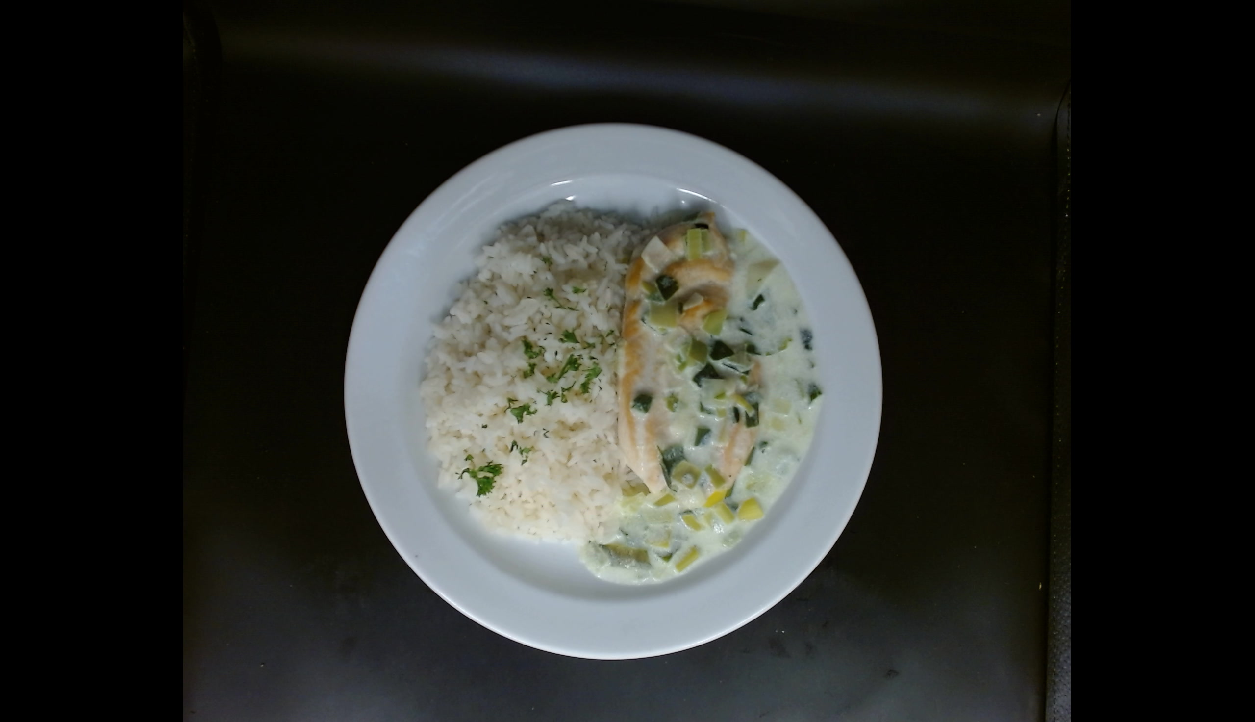 Kuřecí plátek na pórku a smetaně, dušená rýže