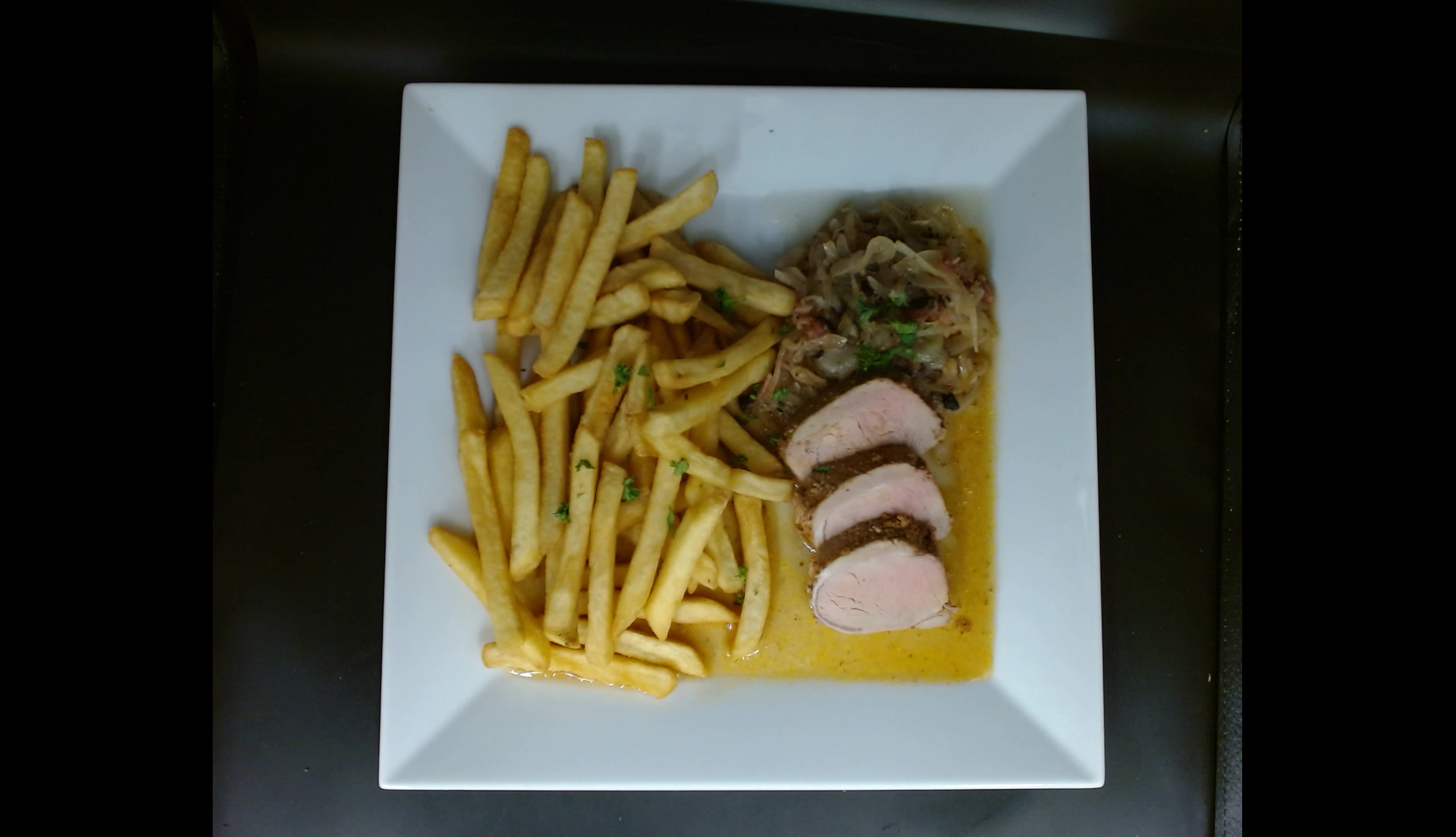 Vepřová panenka z palce se slaninou a cibulí, bramborové hranolky