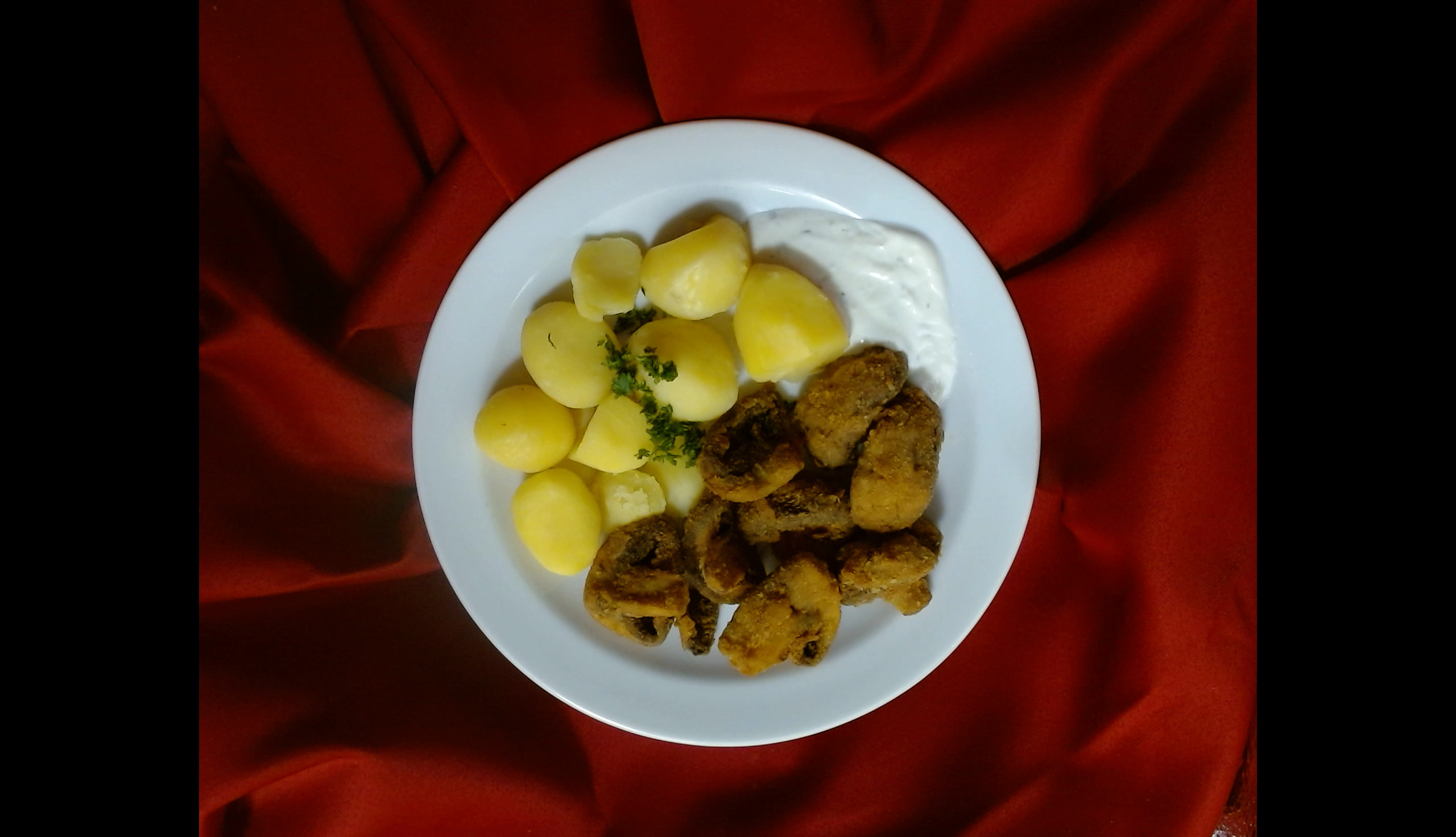 Smažené žampiony, vařené brambory, proteinový bylinkový dip