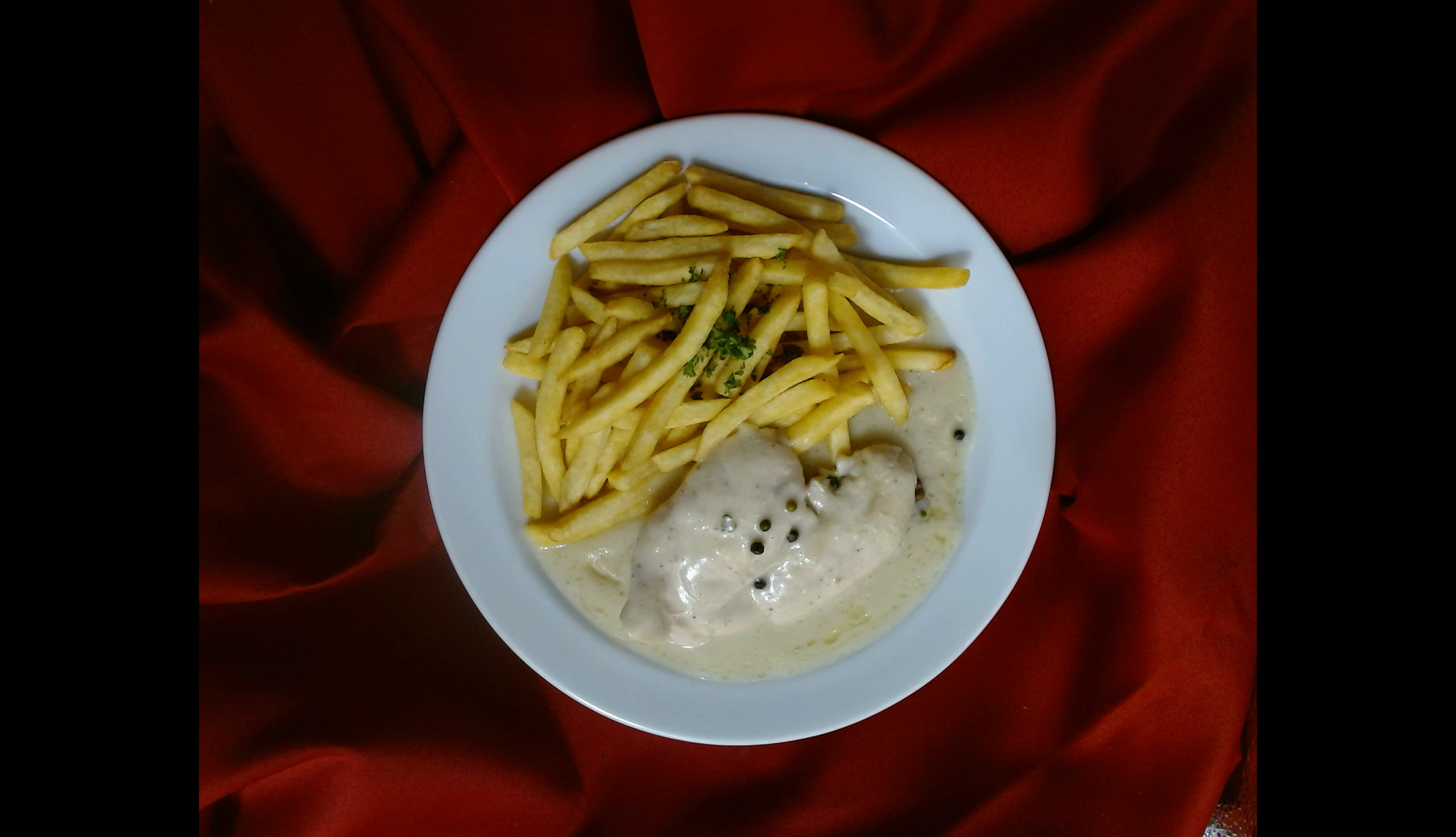 Kuřecí plátek s omáčkou ze zeleného pepře, bramborové hranolky