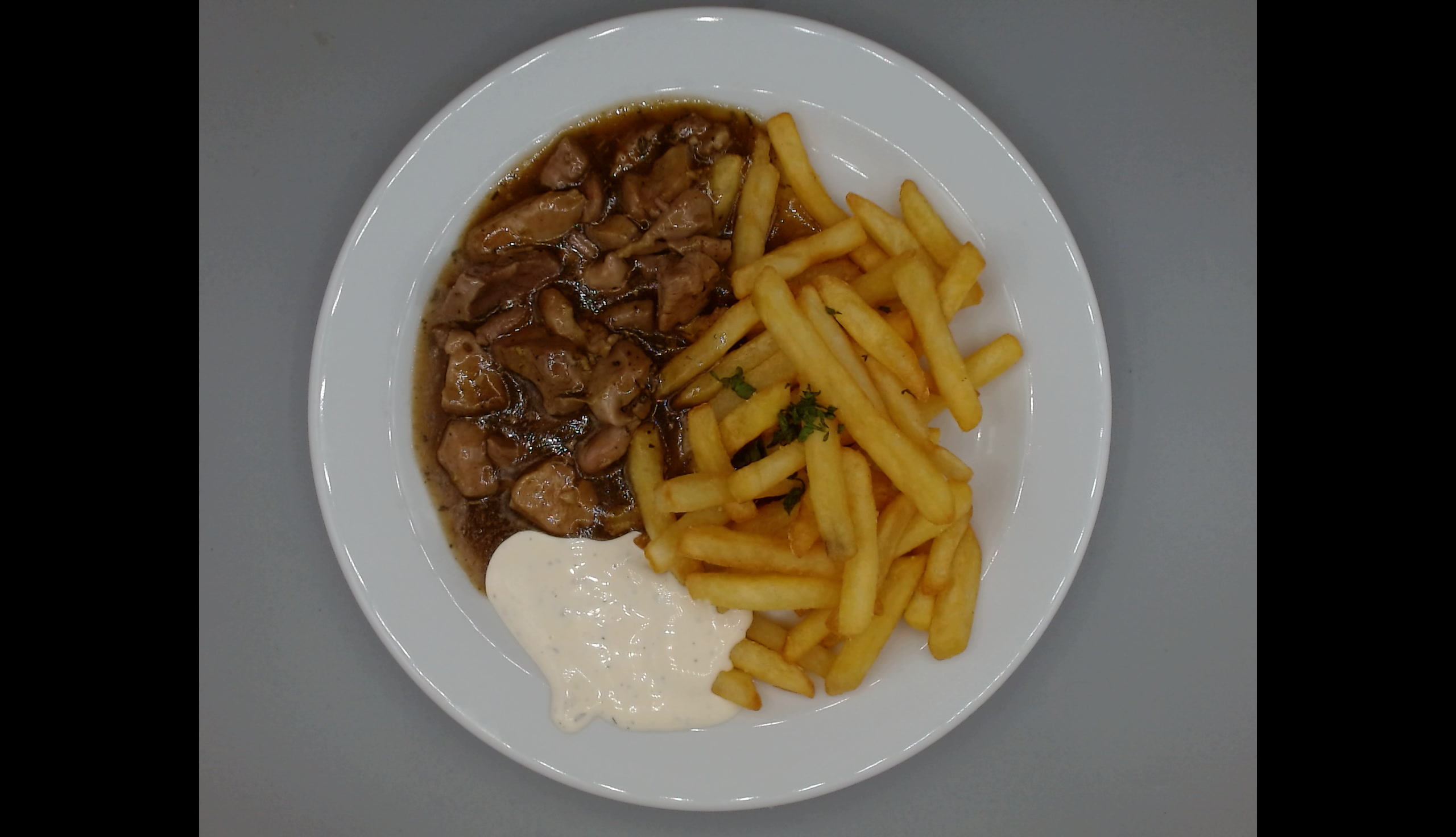 Krůtí nudličky na bylinkách, hranolky, dip