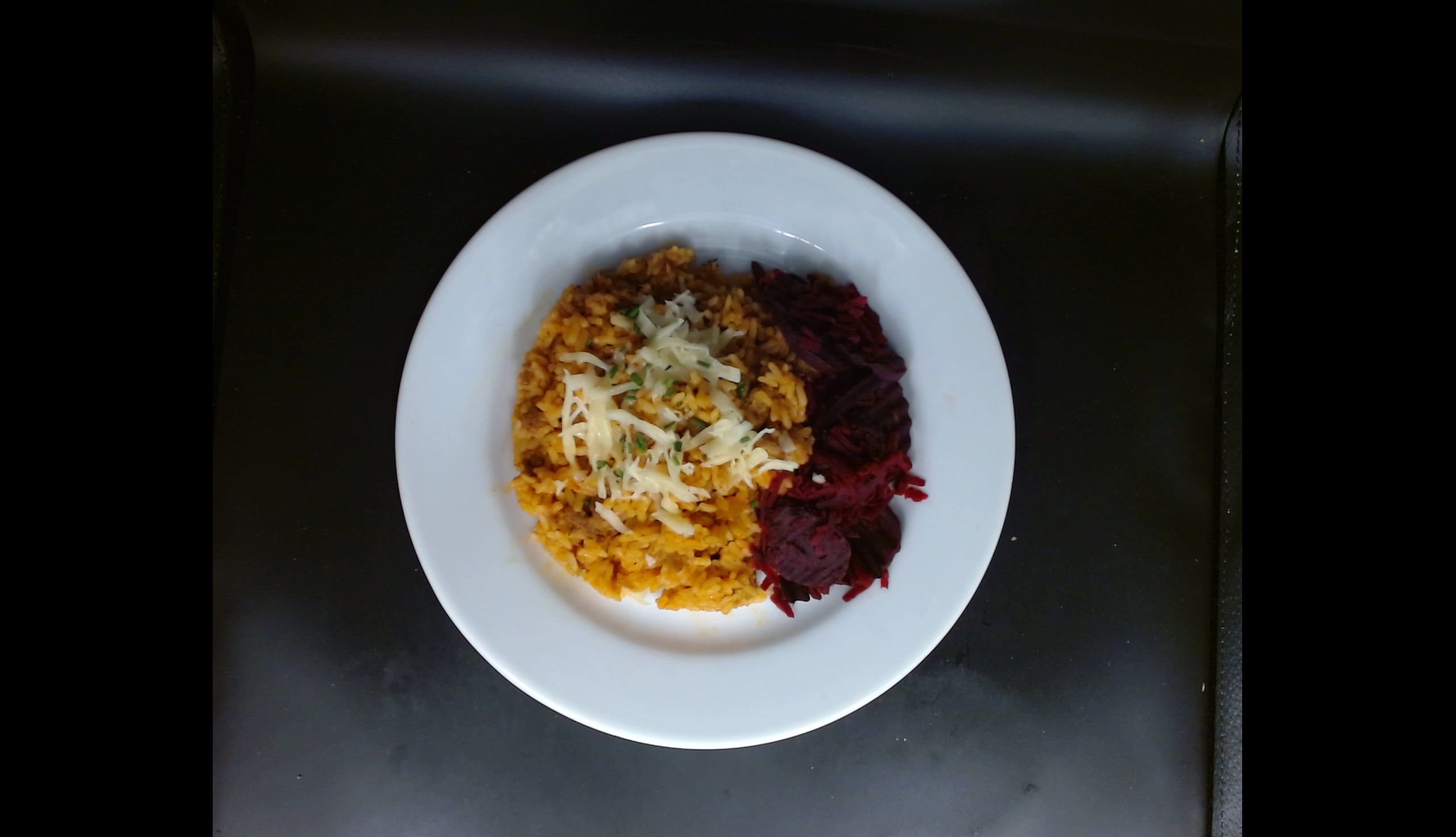 Srbské vepřové rizoto sypané sýrem, červená řepa sterilovaná