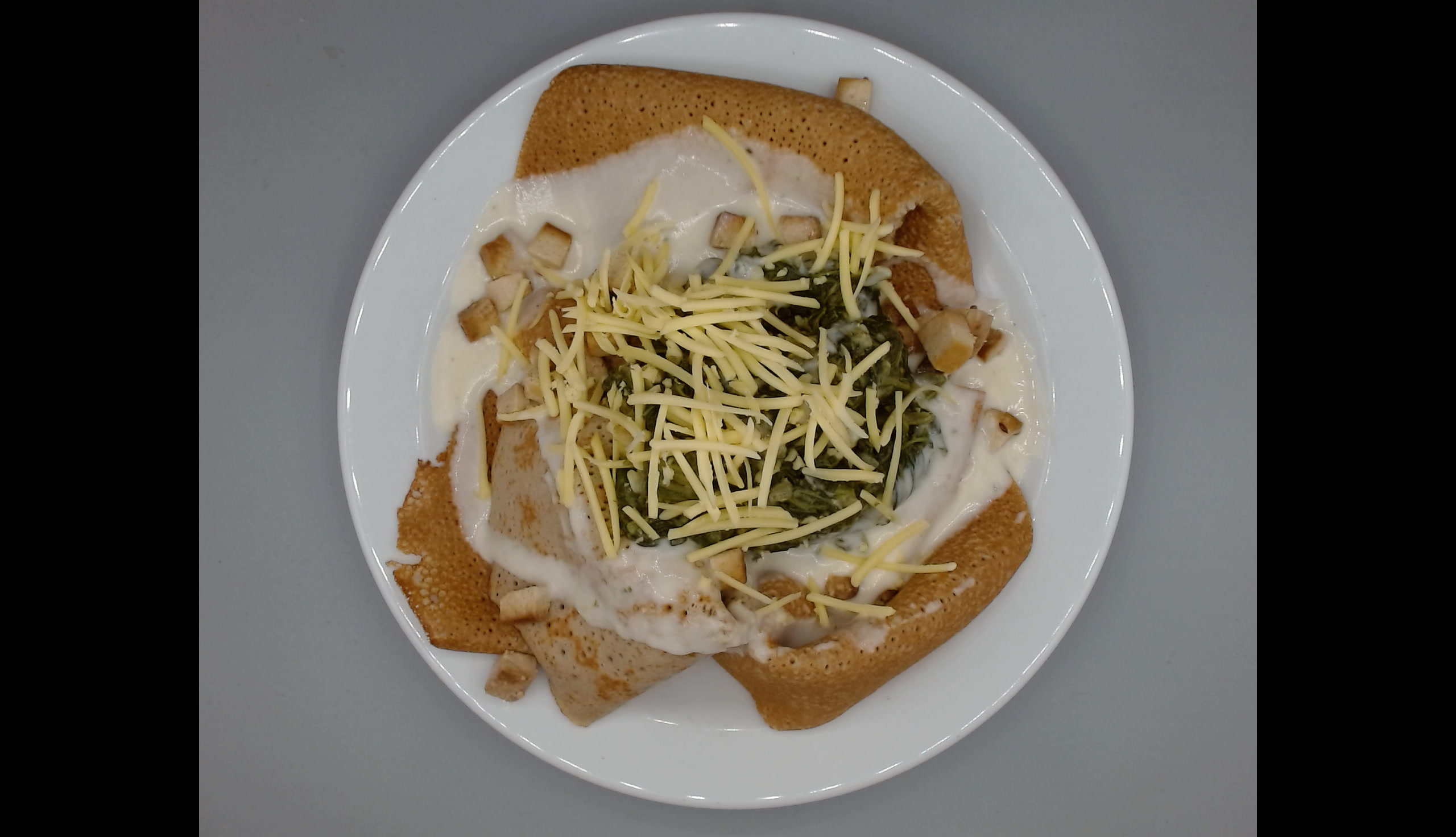 Pohankové palačinky s listovým špenátem, sýrem a uzeným tofu