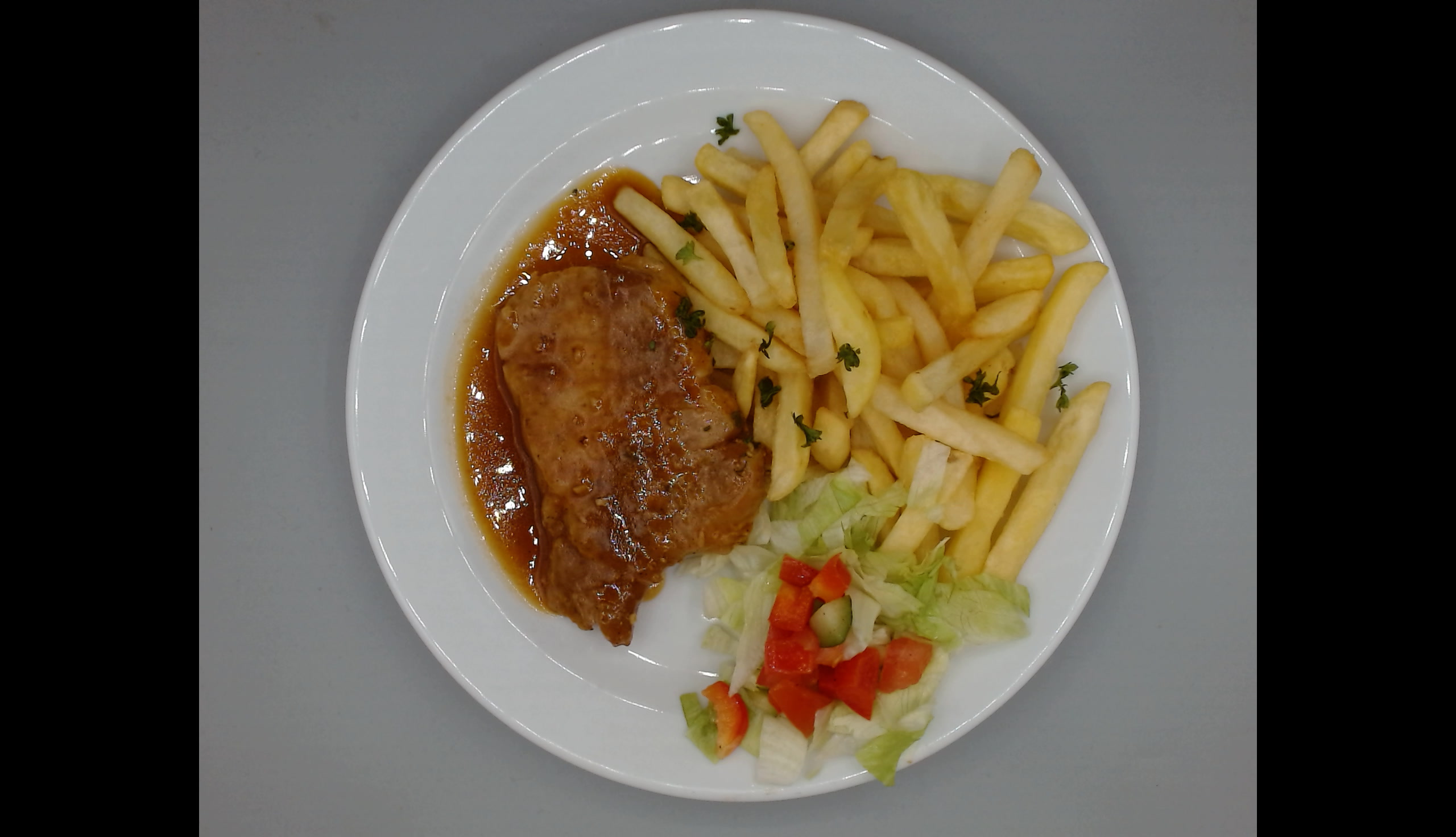 Vepřové žebírko na medu, hranolky, zeleninový salát