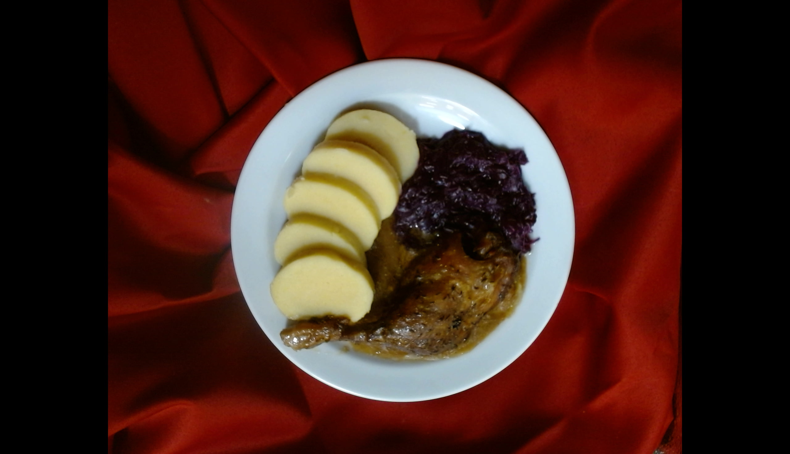 Pečené kachní stehno, červené zelí, bramborové knedlíky
