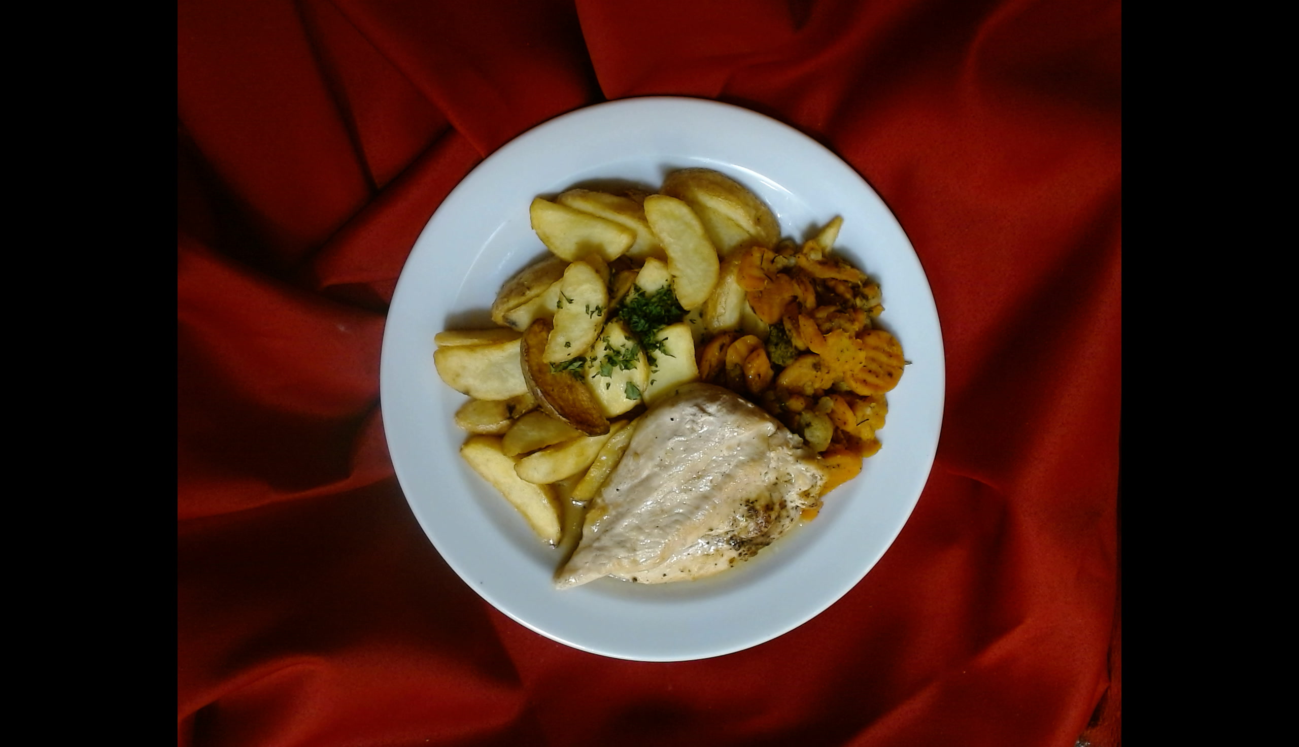 Kuřecí steak, bretaňská zelenina na másle, americké brambory