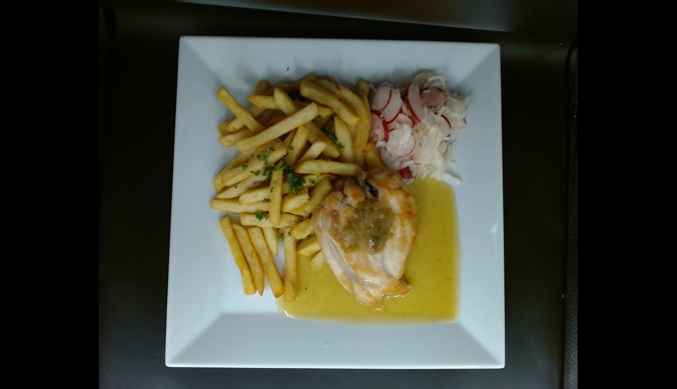 Kuřecí steak s jalapeňos, zelný salát s ředkvičkami, hranolky
