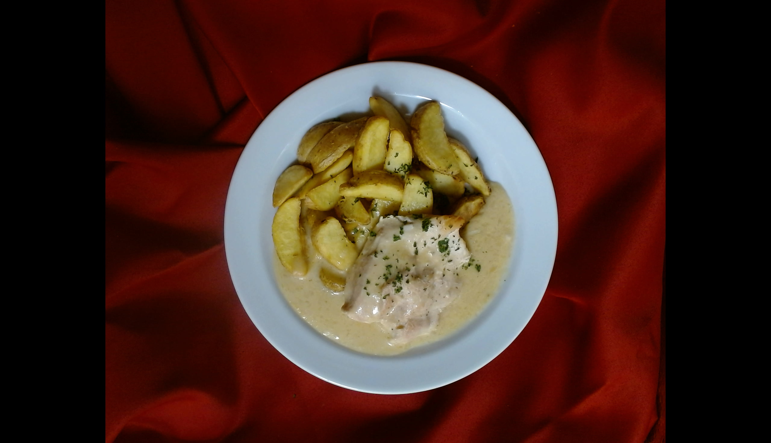 Kuřecí steak s česnekovým přelivem, americké brambory