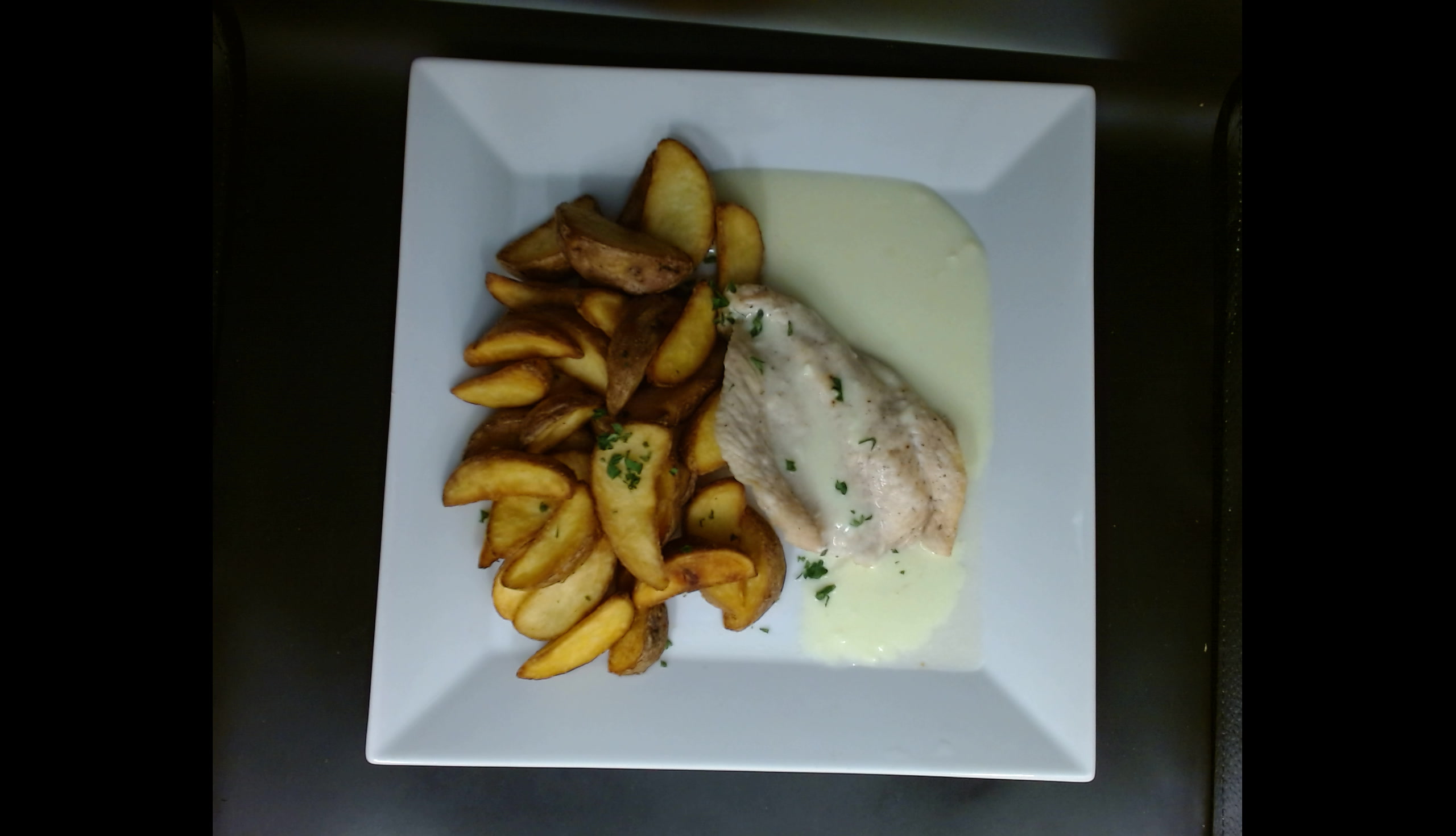 Kuřecí steak s česnekovým přelivem, americké brambory