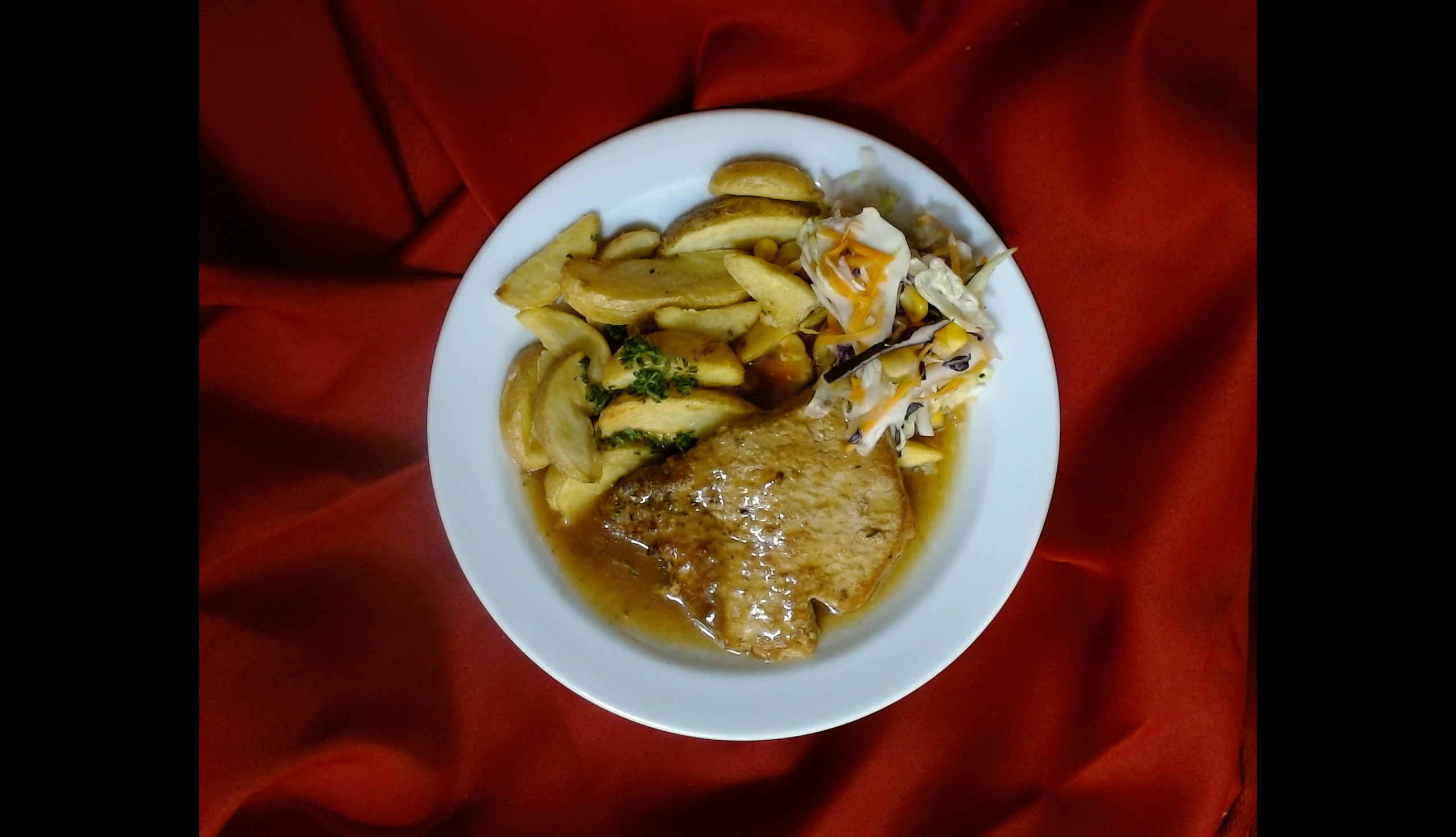 Vepřový steak,americké brambory,zeleninová obloha