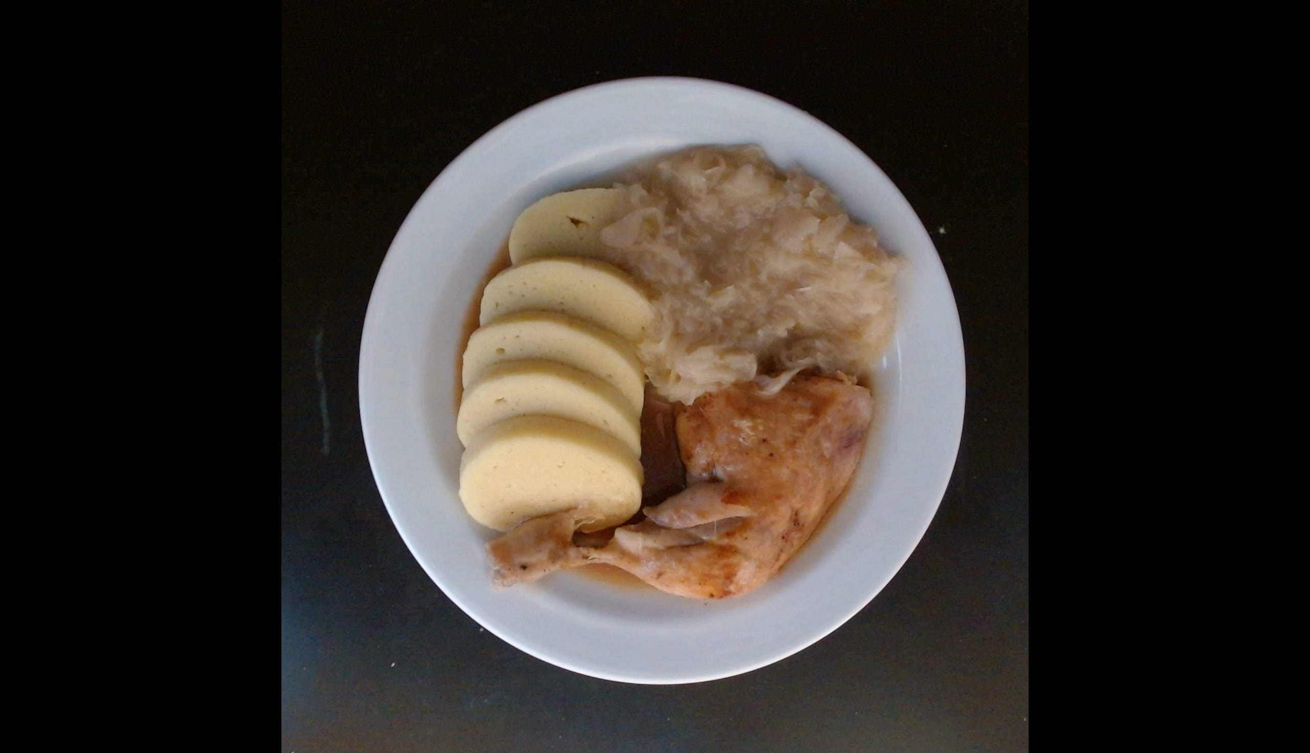 Pečené kuřecí stehno na divoko, dušené zelí, bramborový knedlík