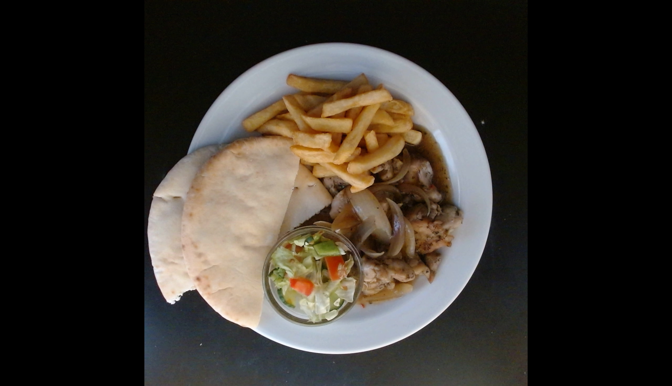 Krůtí gyros, pita chléb, 1/2 hranolky, zelný salát s ředkvičkou