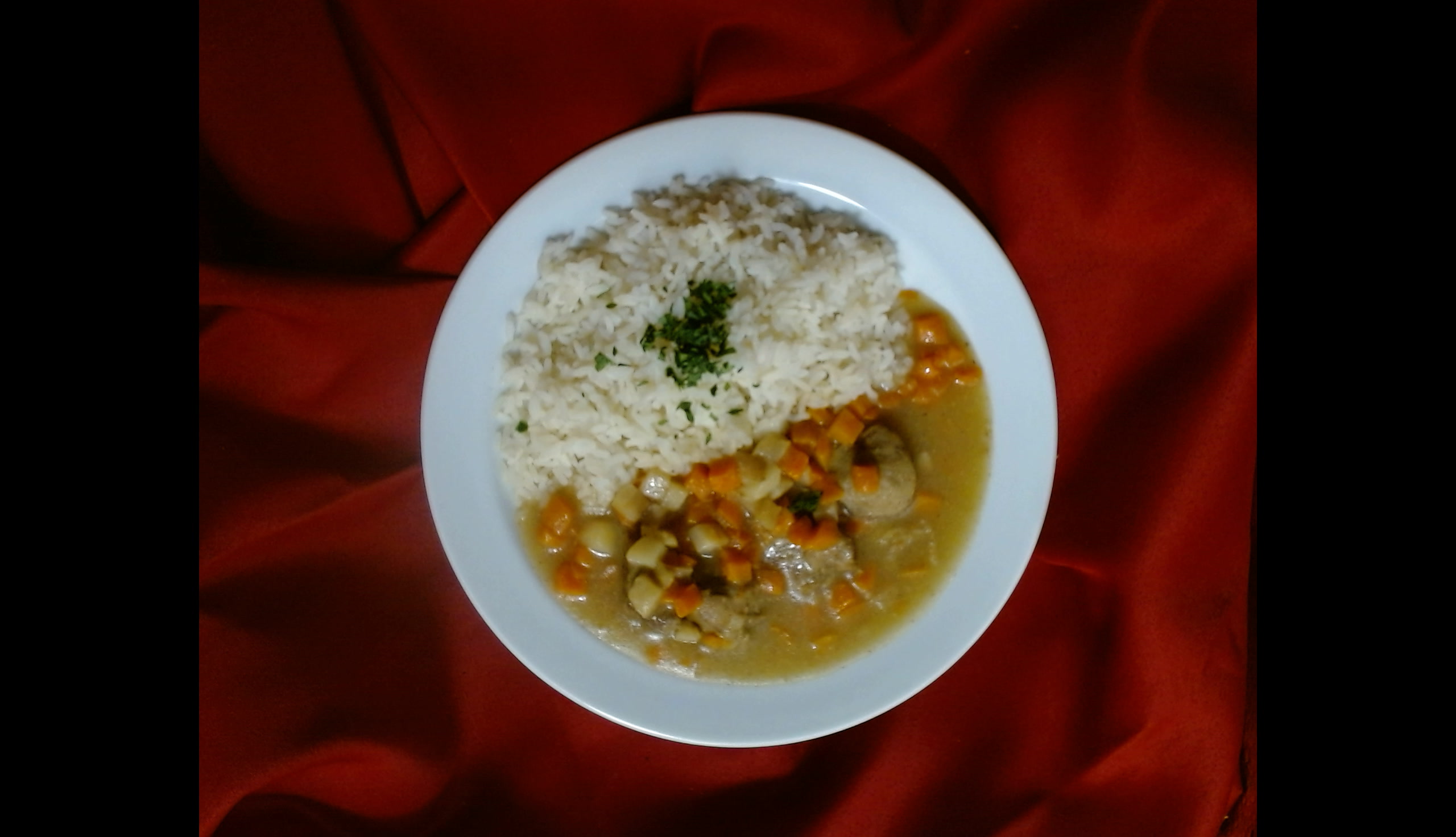 Vepřové kostky na kořenové zelenině,dušená rýže