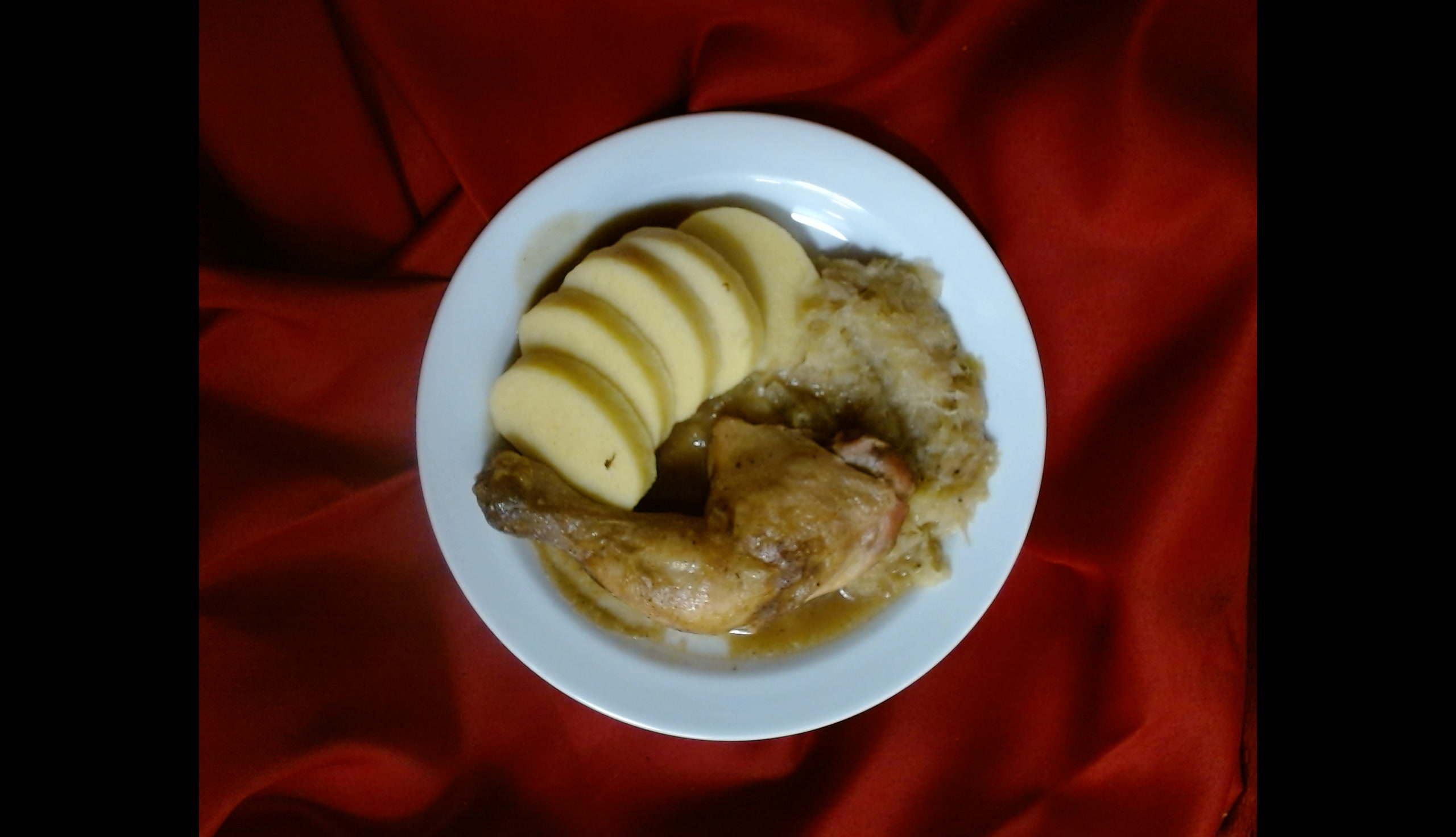 Pečené kuřecí stehno na divoko, dušené zelí, bramborový knedlík