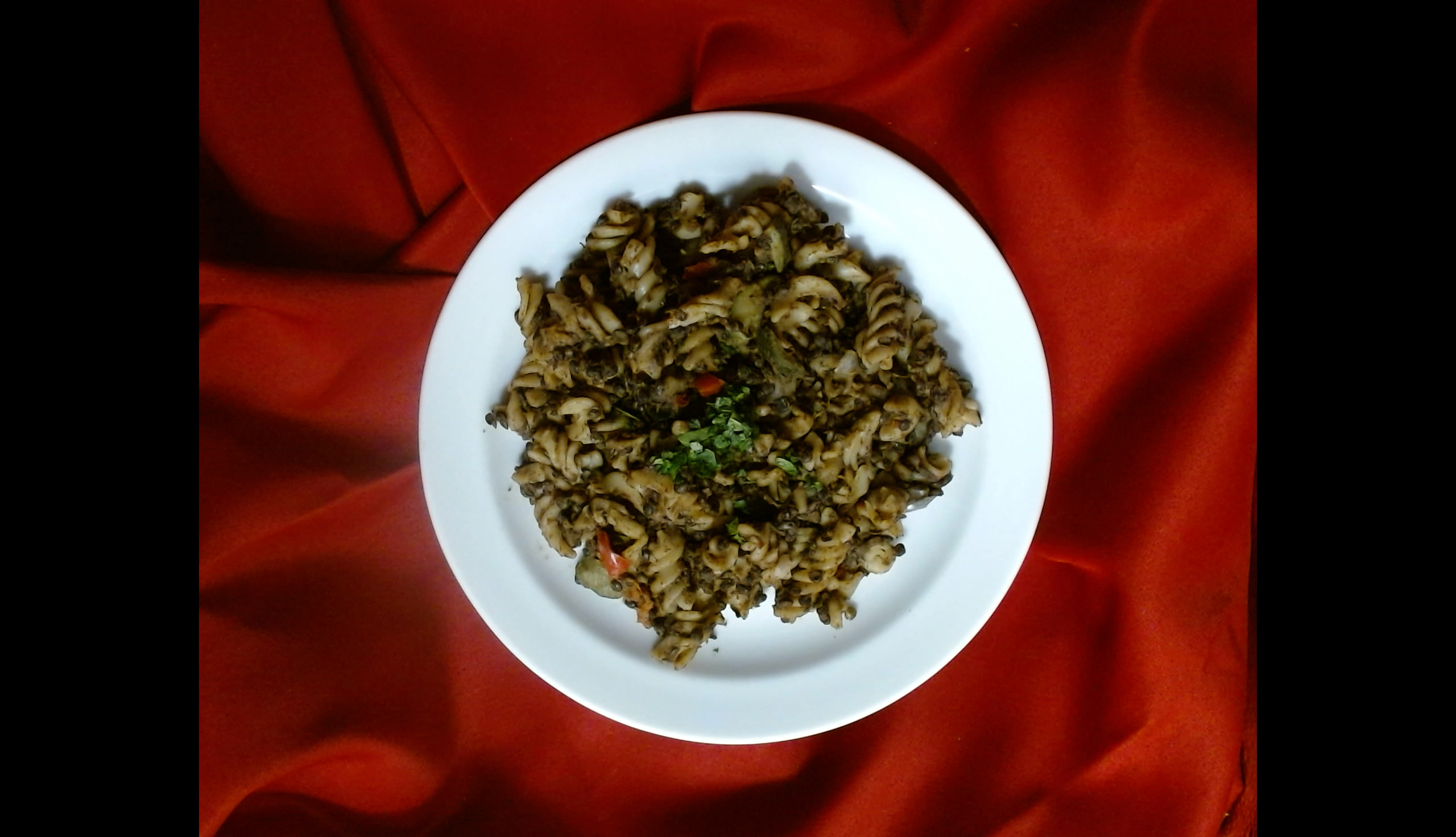Fusilli s černou čočkou beluga a zeleninou