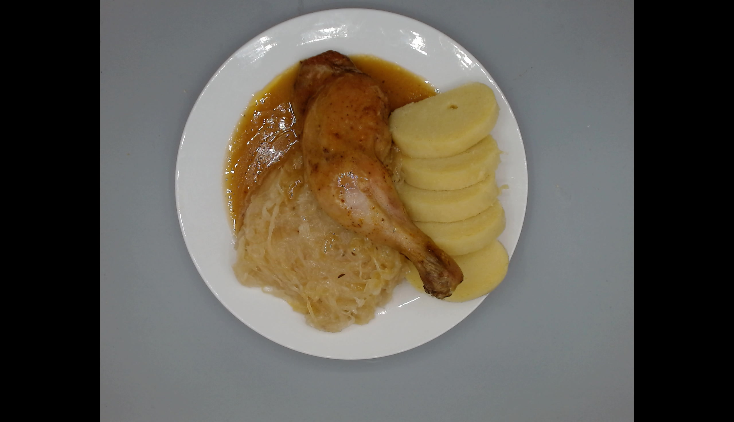 Pečené kuřecí stehno na divoko, dušené zelí, bramborový knedlík