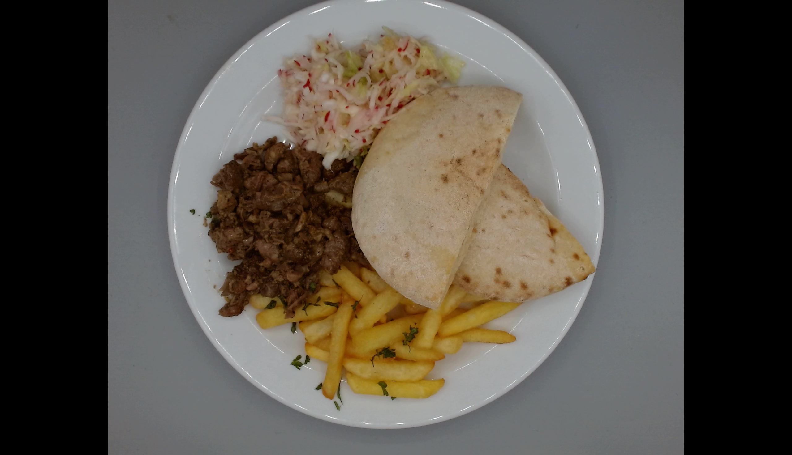 Krůtí gyros, pita chléb, 1/2 hranolky, zelný salát s ředkvičkou