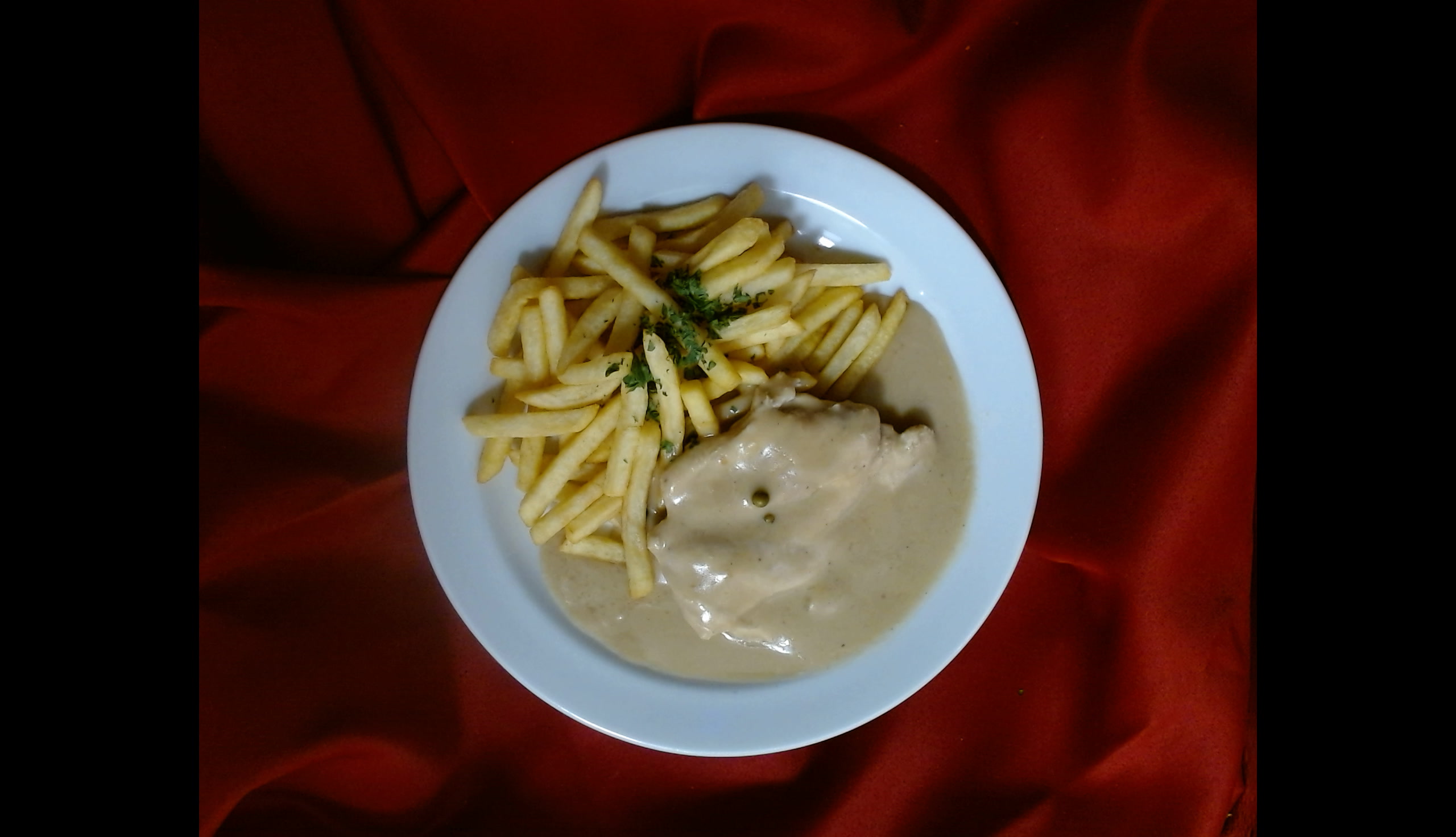 Kuřecí plátek s omáčkou ze zeleného pepře, bramborové hranolky