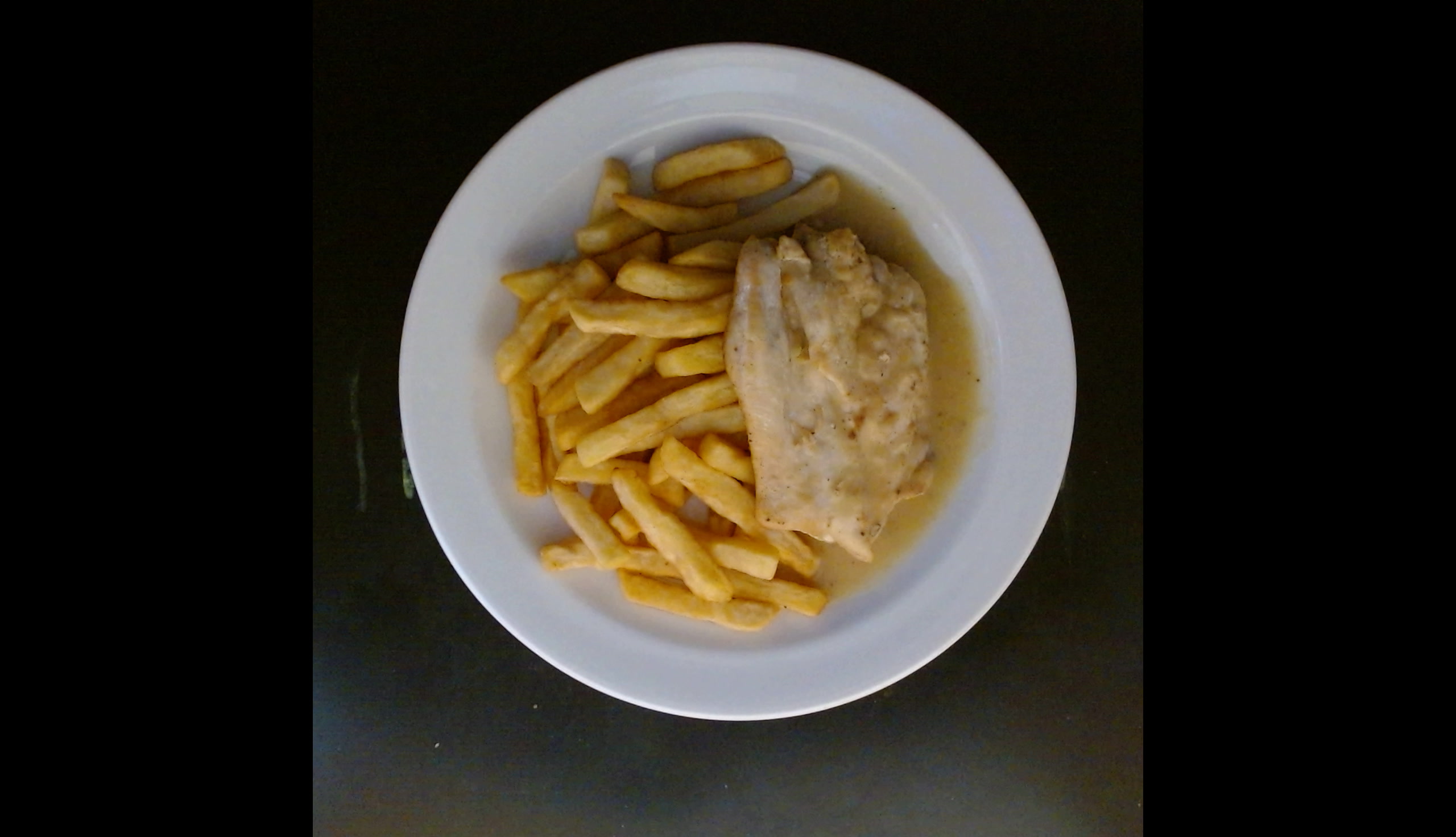 Kuřecí plátek s omáčkou ze zeleného pepře, bramborové hranolky