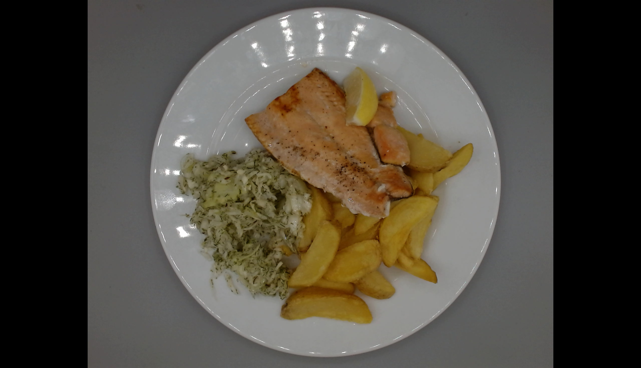 Losos s citrónem, americké brambory, zelný salát