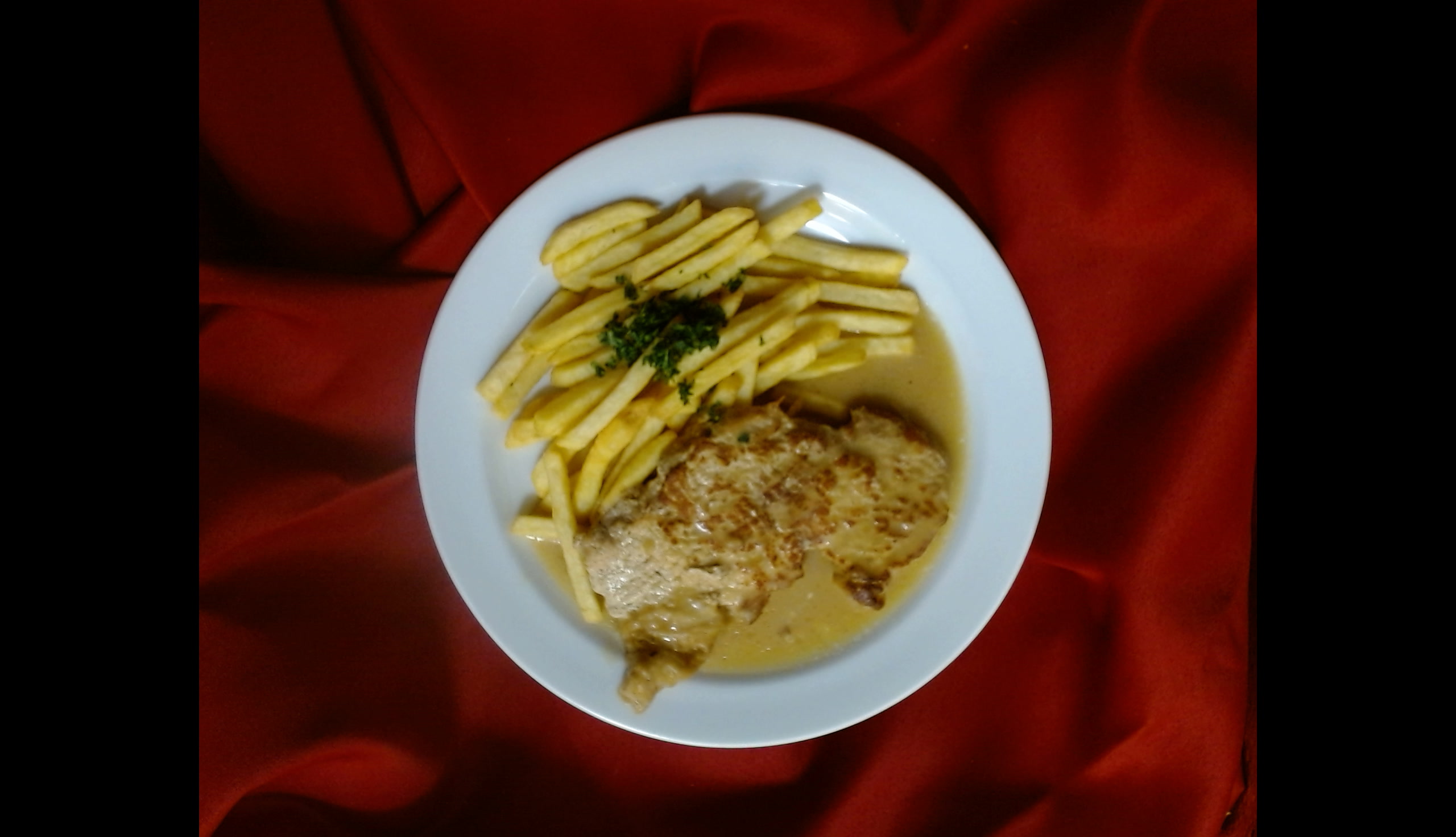 Vepřová kotleta s hořčičnou omáčkou, hranolky