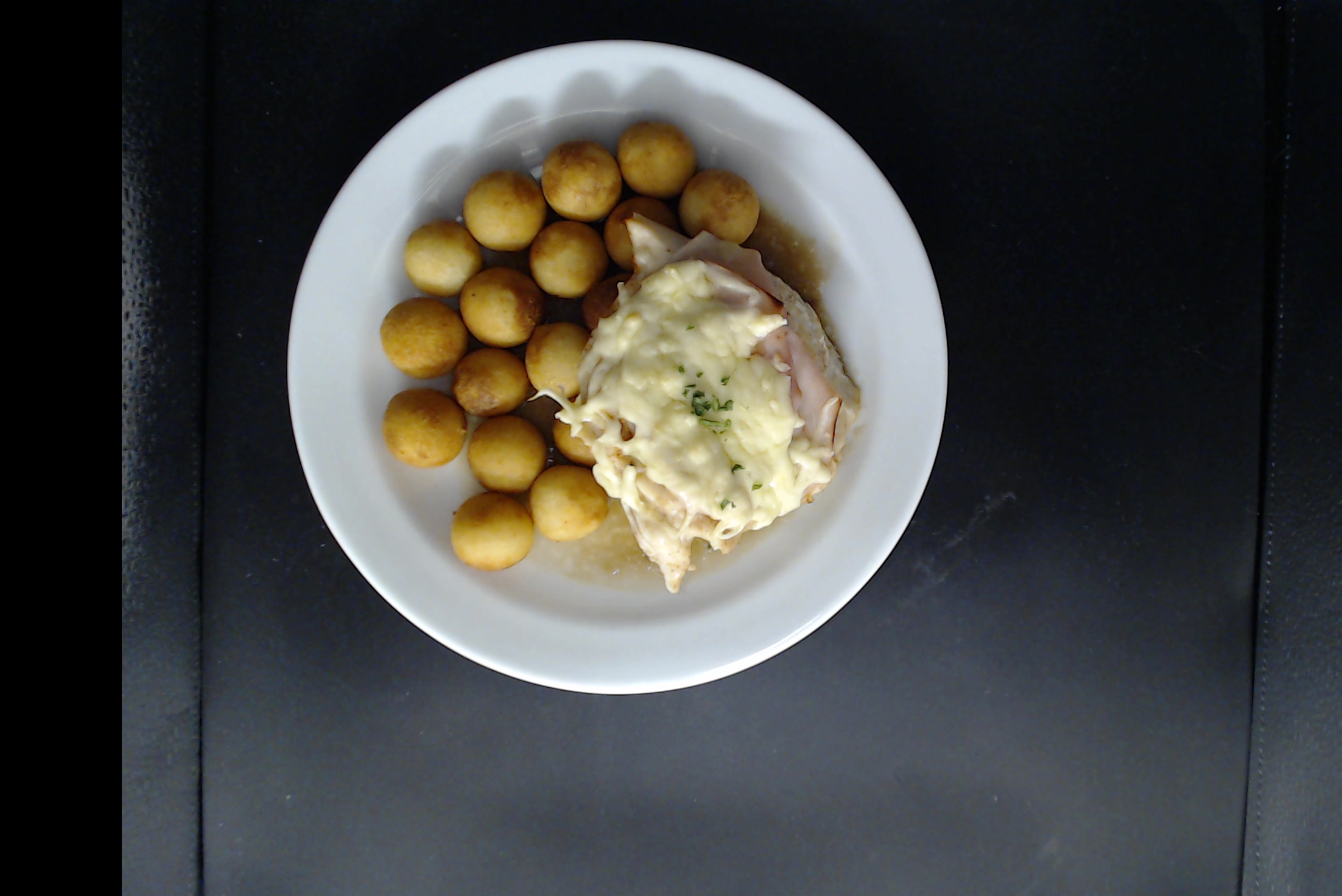 Smažené kuřecí frikadely se sýrem,bramborové hranolky,proteinový bylinkový dip